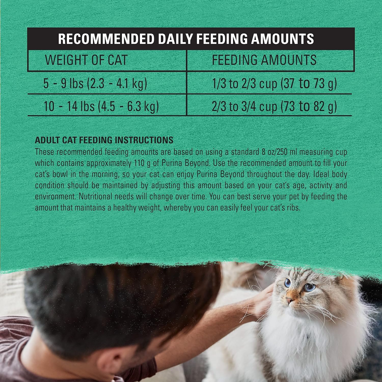 - Directions: ADULT CAT FEEDING INSTRUCTIONS These recommended feeding amounts are based on using a standard 8 oz/250 ml measuring cup which contains approximately 110 g of Purina Beyond. Use the recommended amount to fill your cat’s bowl in the morning, so your cat can enjoy Purina Beyond throughout the day. Ideal body condition should be maintained by adjusting this amount based on your cat’s age, activity and environment. Nutritional needs will change over time. You can best serve your pet by feeding the amount that maintains a healthy weight, whereby you can easily feel your cat’s ribs. MAKING THE SWITCH TO PURINA BEYOND Although you’ll be anxious to see the difference Purina Beyond can make in your cat, please allow 7 - 10 days to ease the transition from your cat’s current food. This will help avoid stomach upset. Each day, simply feed a little less of the previous food and a little more Purina Beyond until you’re feeding Purina Beyond exclusively. NO SUPPLEMENTS NECESSARY Purina Beyond provides 100% complete and balanced nutrition for adult cats. There is no need to add vitamins, minerals or other supplements, unless specifically directed by a veterinarian. FRESH WATER, PROPER DIET & VETERINARY CARE Be sure to provide fresh water in a clean container for your cat daily. Proper diet, exercise and veterinary care are the best ways to keep your cat healthy. If your cat hasn’t had a check-up in the past year, please make an appointment today. Contains a source of live (viable) naturally occurring microorganisms.