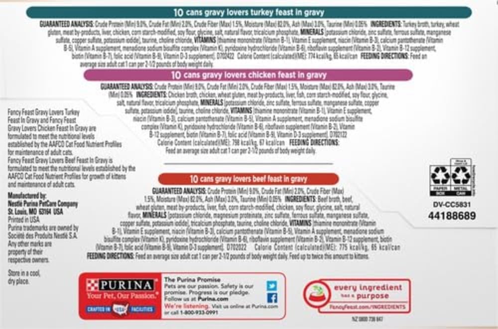 Offer your discerning cat the gourmet tastes she loves with Purina Fancy Feast Gravy Lovers Poultry and Beef Feast Collection wet cat food. Chicken, turkey and beef give this collection the savory taste she craves, and the rich gravy in every serving of this canned cat food is sure to have her licking her dish clean. Small, delicate bites slow-cooked to perfection deliver a tempting texture, and the assortment of flavors makes it easy to keep your cat's curiosity piqued at mealtime. With essential vitamins and nutrients to support her overall health and wellness, this gourmet wet cat food lets you feel good about the foods you put into her dish. Offer up a different delectable flavor at each feeding, and show your feline friend just how important she is to you and your family with this collection of mouthwatering Fancy Feast Gravy Lovers cat food cans. She shouldn't have to wait for dinner, and you shouldn't have to, either. Get Purina Fancy Feast wet cat food fast from Amazon.com.