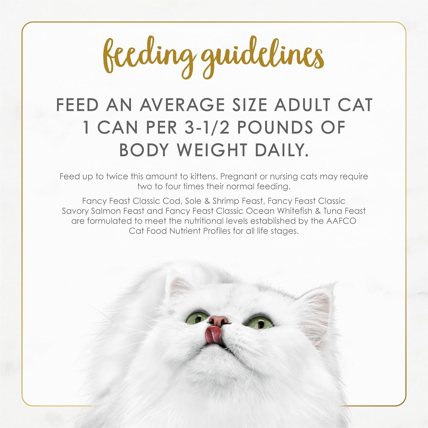 - Directions: Cod, Sole & Shrimp Feast Feed an average size adult cat 1 can per 3 to 3-1/2 pounds of body weight daily. Feed up to twice this amount to kittens. Pregnant or nursing cats may require two to four times their normal feeding.; Savory Salmon Feast Feed an average size adult cat 1 can per 3 to 3-1/2 pounds of body weight daily. Feed up to twice this amount to kittens. Pregnant or nursing cats may require two to four times their normal feeding.; Ocean Whitefish & Tuna Feast Feed an average size adult cat 1 can per 2-1/2 pounds of body weight daily. Feed up to twice this amount to kittens. Pregnant or nursing cats may require two to four times their normal feeding. 0