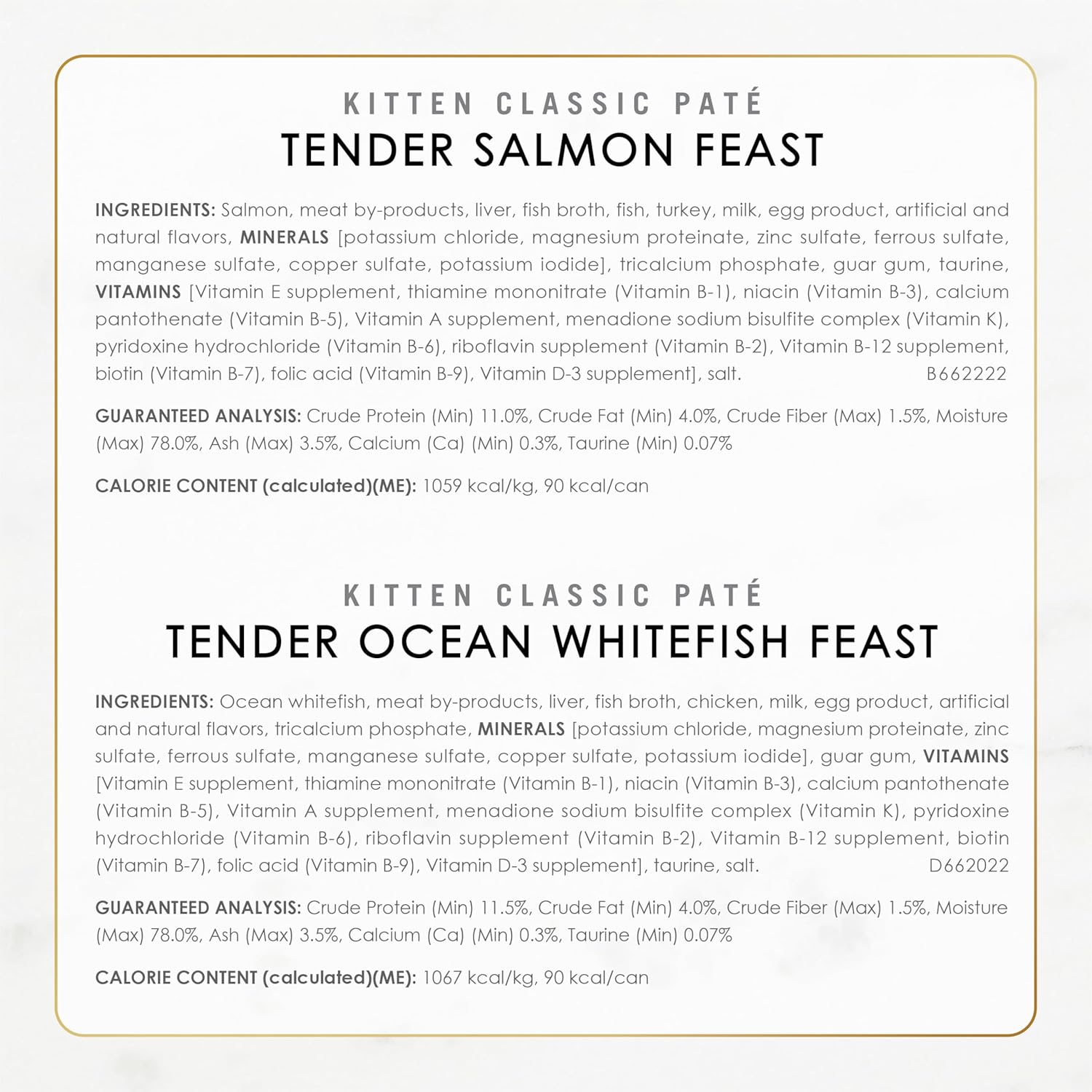 Get your adorable kitten off to a great start in life by filling her dish with the delicious recipes contained in the Purina Fancy Feast Tender Feast wet kitten food variety pack. Ocean Whitefish, Turkey, Chicken and Salmon formulas with a touch of real milk provide high-quality protein to help support her growing muscles. Each tempting recipe features real poultry or seafood as the number 1 ingredient, so you can feel confident you're providing your growing feline with the wholesome nutrition she needs to thrive. Our Tender Feast recipes feature a soft pate texture that's just right for small mouths to nibble. Fancy Feast kitten food is specially formulated to provide 100 percent complete and balanced nutrition for your kitten during her first year of life. The wet kitten food comes in pull-tab cans for convenient serving and storage, making it easy to introduce your little one to the four inspired gourmet recipes in the Fancy Feast Tender Feast kitten food variety pack.