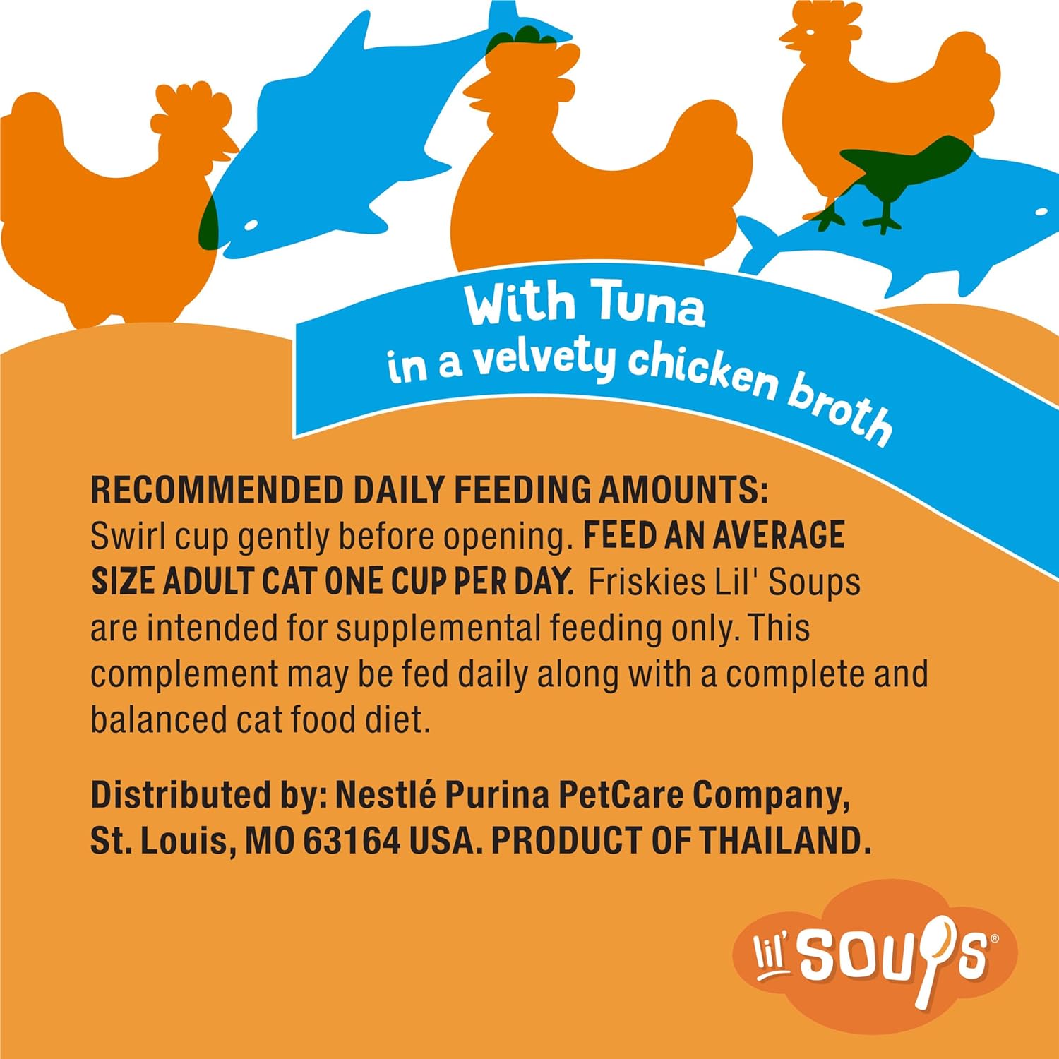 - Directions: Swirl cup gently before opening. Feed an average size adult cat one cup per day. Friskies Lil' Soups are intended for supplemental feeding only. This complement may be fed daily along with a complete and balanced cat food diet.