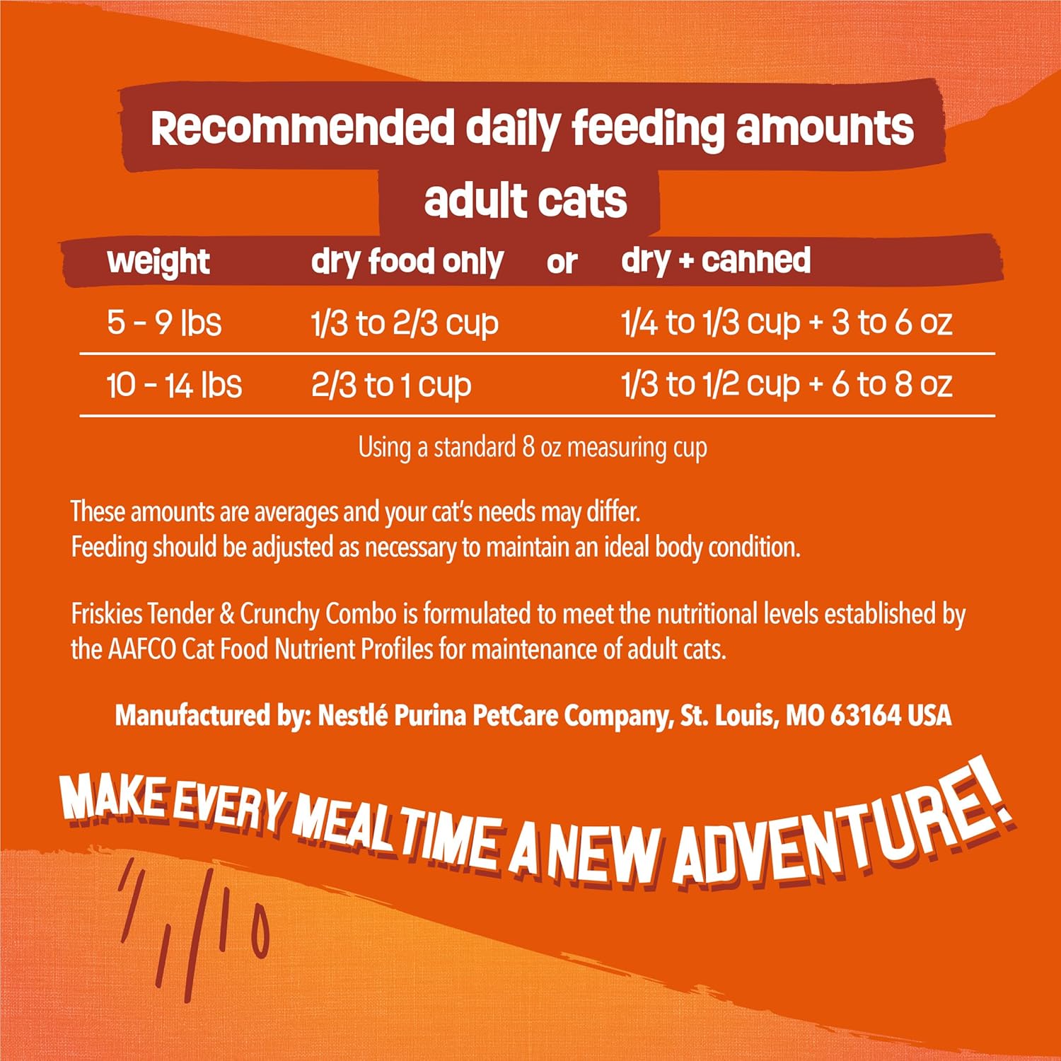 Get your cat purring at mealtime with the tempting texture combination found in Purina Friskies Tender and Crunchy Combo dry adult cat food. Meaty tenders and crunchy bits give her more to love in every serving, and the pleasing shapes get her excited to nibble her way to a happy belly. This cat food with flavors of real chicken and beef with accents of garden greens lets you feel good about giving your cat a delectable meal while delivering the Friskies taste cats crave. Featuring a formula that offers 100 percent complete and balanced nutrition for adult cats, this dry cat food gives her all the nutrition she needs for her adventurous adult years. High-quality protein helps support strong muscles, and essential fatty acids in this recipe support your furry friend's skin and coat. With so much yummy goodness, this dry kibble cat food shows her how much you care.