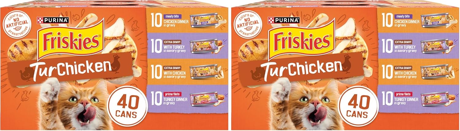 About this item The information below is per-pack only Soft cat food made with real chicken or turkey with savory gravies for added moisture and softness Wet food for cats featuring tender chunks for a texture cats love with 100 percent complete and balanced nutrition for adult cats with no artificial colors or preservatives Moist cat food containing essential vitamins and minerals Purina Friskies cat food manufactured in Purina-owned facilities in the USA and rigorously checked for quality and safety Soft cat food recipes packaged in easy pull-tab recyclable cans › See more product details