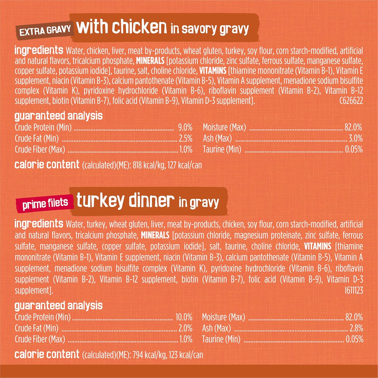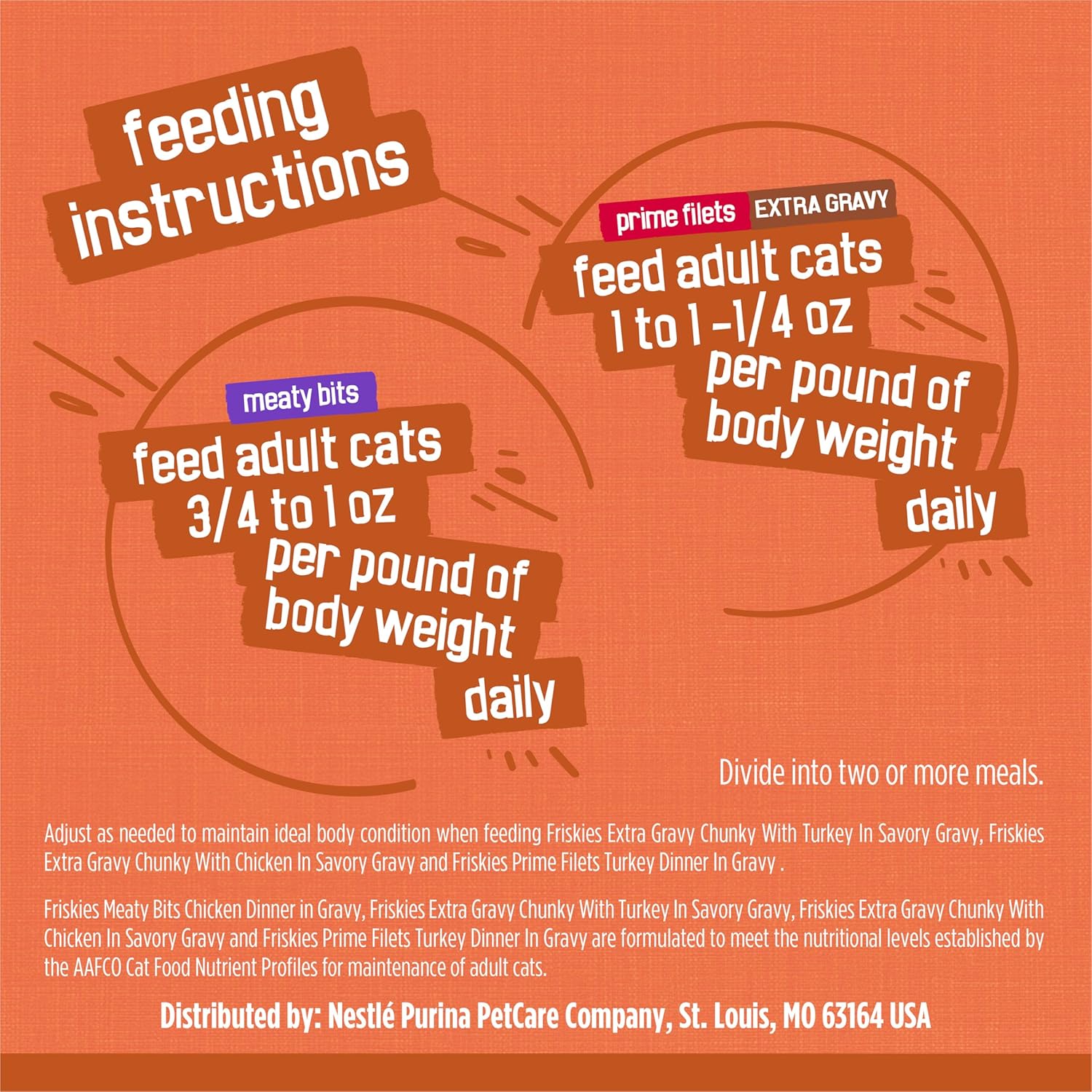 - Directions: Meaty Bits Chicken Dinner in Gravy Feed adult cats 3/4 - 1 oz per pound of body weight daily. Divide into two or more meals. Extra Gravy Chunky With Chicken in Gravy Feed adult cats 1 - 1 1/4 oz per pound of body weight daily. Divide into two or more meals. Adjust as needed to maintain ideal body condition. Extra Gravy Chunky With Turkey in Savory Gravy Feed adult cats 1 - 1 1/4 oz per pound of body weight daily. Divide into two or more meals. Adjust as needed to maintain ideal body condition. Shreds Turkey & Giblets in Gravy Feed adult cats 3/4 - 1 oz per pound of body weight daily. Divide into two or more meals.