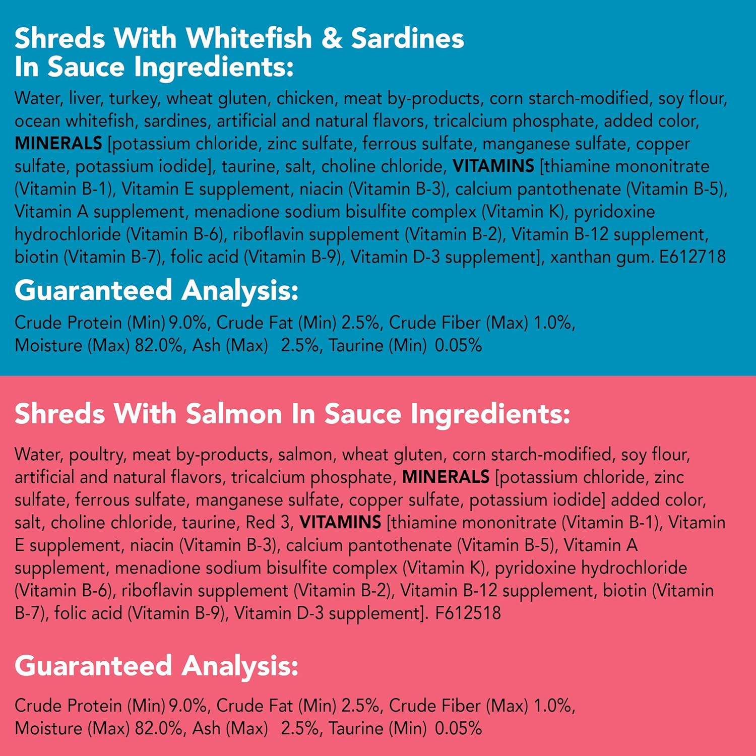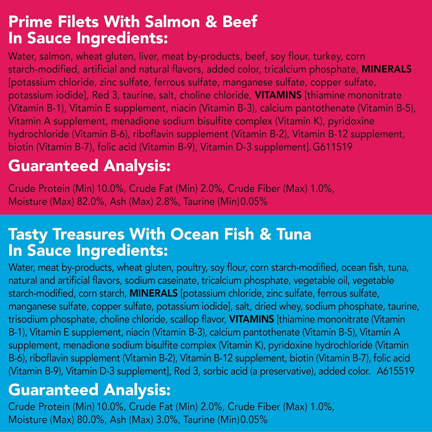 Delight your novelty-seeking feline with the four different recipes in the Purina Friskies Fish-A-Licious wet cat food variety pack. Premium select ingredients, including whitefish, sardines, salmon or tuna, appeal to her smart, sophisticated palate, and the assortment of flavors lets you keep your cat's curiosity piqued at every mealtime. These yummy recipes feature thinly shredded pieces with seafood in a thick sauce from our delicious Savory Shreds line of wet adult cat food. We also include shredded chunks with seafood cooked in savory juices from our Prime Filets line and the delectable flavor of our Tasty Treasures With Ocean Fish and Tuna and Scallop Flavor in Sauce. The essential vitamins and nutrients support her overall health and wellness, and your adult cat gets the 100 percent complete and balanced nutrition she needs to thrive in every serving. We craft our Purina Friskies wet cat food in U.S. facilities and package it in pull-tab cans for quick and easy serving.