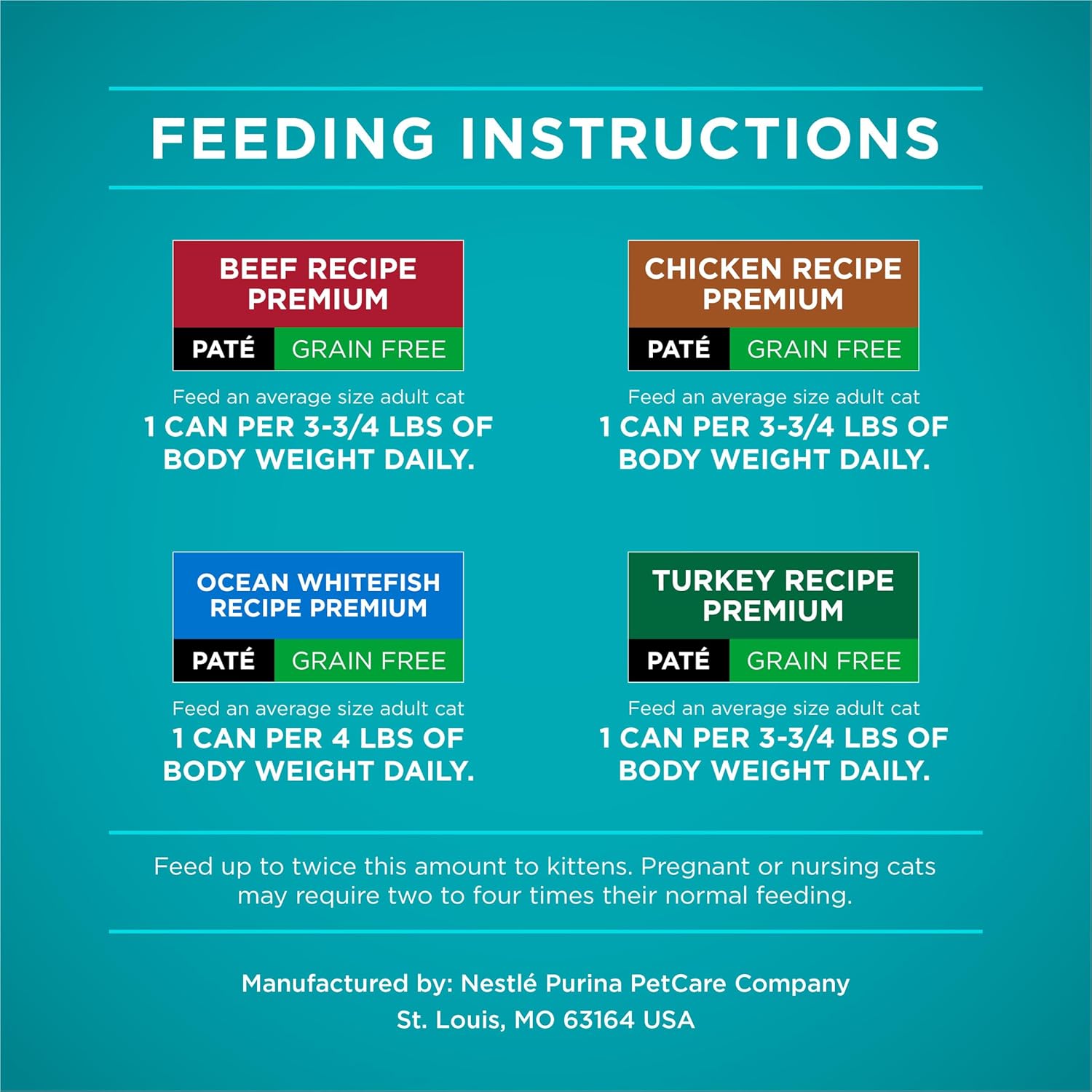 Take your cat on a tasty adventure when you open any can from this Purina ONE High Protein Grain Free Pate wet cat food variety pack. Four delicious soft cat food recipes deliver the tastes your cat loves and the variety she craves. Each cat wet food recipe begins with real meat, poultry or fish as the number one ingredient, so you can be confident she's getting high-quality ingredients. Plus, every serving is high in protein to help support her strong muscles, and the delicious flavors are sure to please her palate. Our canned cat food variety pack delivers 100 percent complete and balanced nutrition and 0 percent fillers. Every ingredient has a purpose. Give your cat companion natural formulas with added vitamins, minerals and nutrients, and show her how much you care about her overall health with this Purina ONE grain free wet cat food pate variety pack.