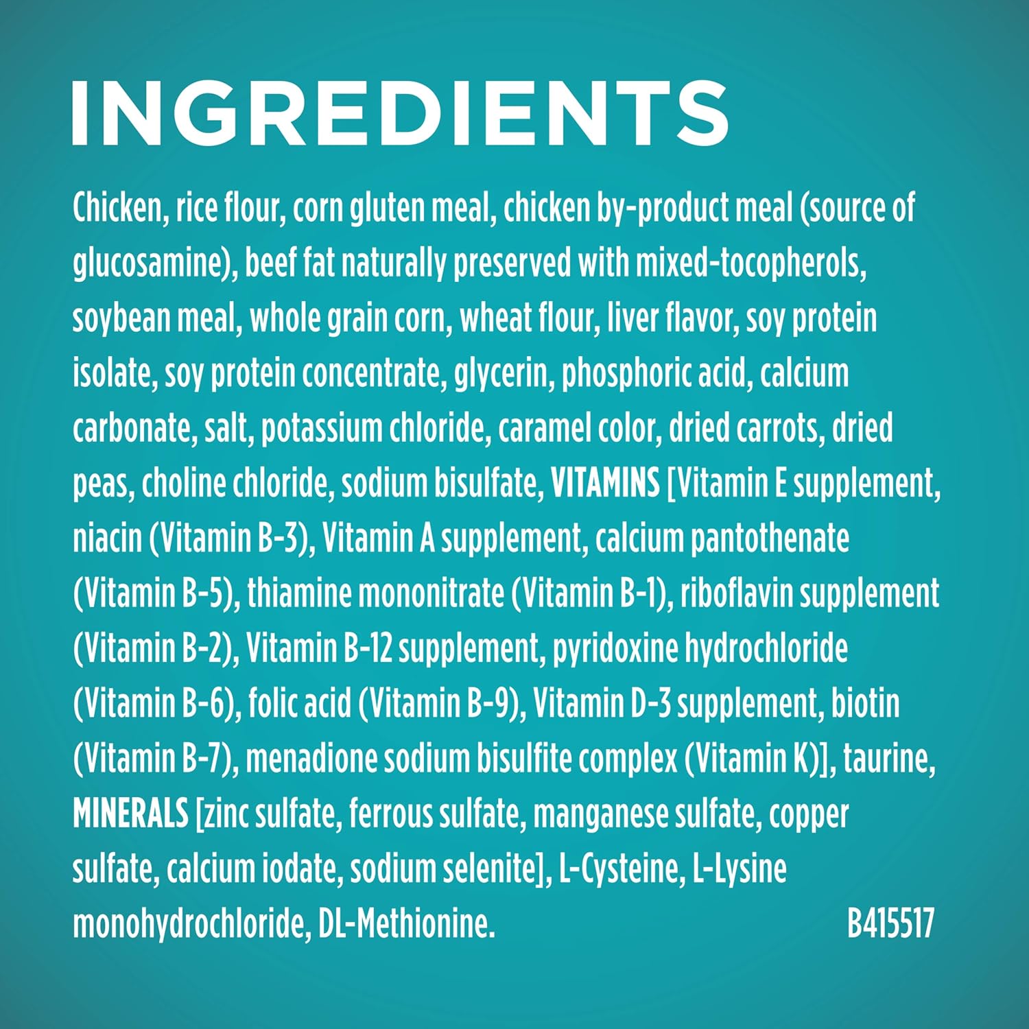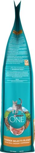 Look for that familiar blue bag to dish up the crunchy cat food kibble and meaty morsels in Purina ONE Tender Selects Blend With Real Chicken adult dry cat food. Is Purina ONE good for cats? To answer that, we use a SmartBlend of purposeful, high-quality ingredients to help craft a premium, adult cat food with 0 percent fillers, 100 percent nutrition. Real chicken is the first ingredient to help provide protein that maintains strong muscles, including a healthy heart. Accents of real carrots and peas go into this Purina ONE chicken cat food for digestive health, and prebiotic cat fiber helps promote gut health and immune system support. Omega-6 fatty acids nourish her skin and coat, and a blend of four antioxidant sources helps support immune health. Along with a great taste, this natural cat food has the added vitamins, minerals and nutrients she needs. Check the packaging for the calories per serving, feeding chart and instructions on changing cat food.