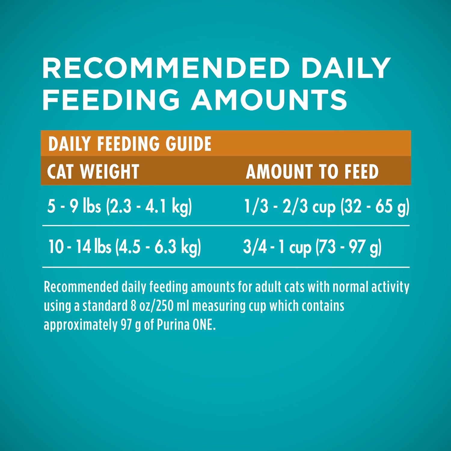 - Directions: Weight of Cat Feeding Amount (lbs) (kg) (cups) (grams) 5 - 9 2.3 - 4.1 1/3 - 2/3 32 - 65 10 - 14 4.5 - 6.3 3/4 - 1 73 - 97 for adult cats with normal activity using a standard 8 oz/250 ml measuring cup which contains approximately 97 g of Purina ONE. ADULT CAT FEEDING INSTRUCTIONS Fill your cat's bowl with the recommended measured amount every morning and allow your cat to eat on a "free choice" basis throughout the day, rather than as a single feeding at mealtime. Food intake required to maintain an ideal body condition will vary, depending on age, activity and environment. Monitor your cat's weight and adjust food amount accordingly. FEED ONLY ONE A cat's digestive system works best when it receives the same food each day. Although humans crave variety in their diets, cats do not. Feeding different cat foods can turn your cat into a finicky eater, and may lead to obesity. For questions related to the health of your cat, see your veterinarian. IT'S NOT FOR ALL CATS Purina ONE Tender Selects Blend With Real Chicken is specifically formulated for adult cats. If you have a kitten, or a pregnant or nursing cat, feed Purina ONE Healthy Kitten Formula. MAKING THE SWITCH TO PURINA ONE Although you'll be anxious to see the difference Purina ONE can make in your cat, please allow 7 - 10 days to ease the transition from your cat's current food. Each day, simply feed a little less of the previous food and a little more Purina ONE until you're feeding Purina ONE exclusively. This gradual transition will help avoid dietary upsets. NO SUPPLEMENTS NECESSARY Purina ONE provides 100% complete and balanced nutrition for maintenance of adult cats. There is no need to add vitamins, minerals or other supplements, unless specifically directed by a veterinarian. FRESH WATER, PROPER DIET & VETERINARY CARE Be sure to provide fresh water in a clean container for your cat daily. Proper diet, exercise and veterinary care are the best ways to keep your cat healthy. If your cat hasn't had a check-up in the past year, please make an appointment today.