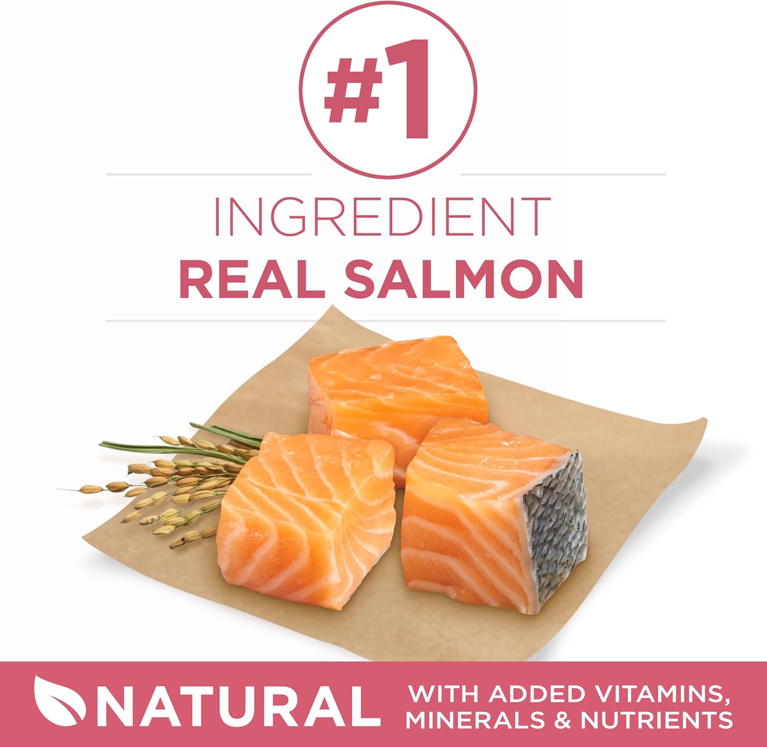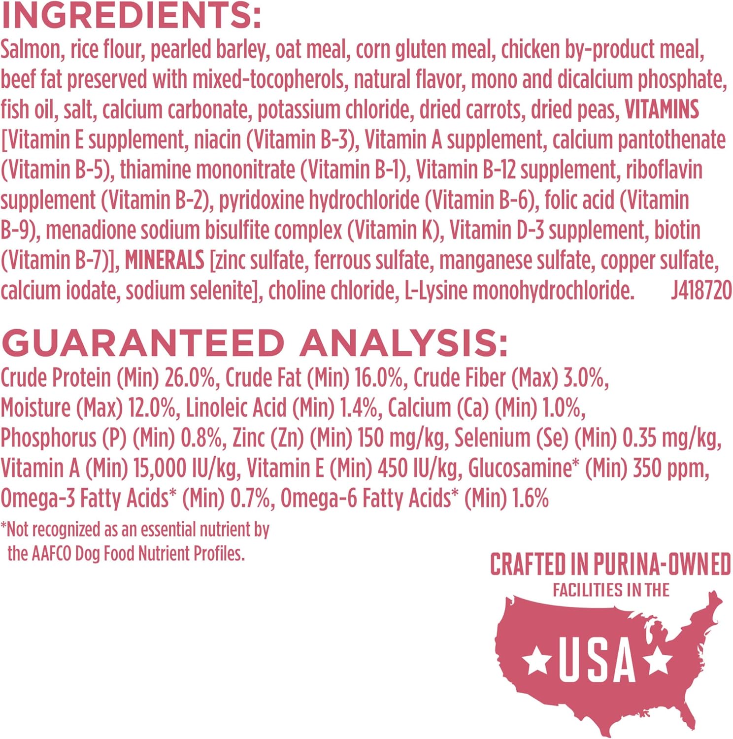 Fill your dog's bowl with the SmartBlend of ingredients found in Purina ONE +Plus Natural Skin & Coat Formula with added vitamins, minerals and nutrients adult dry dog food. This high protein dog food features real salmon as the #1 ingredient, and when combined with rice, oatmeal and other high-quality ingredients, delivers easy-to-digest 100% complete and balanced nutrition for your adult dog. The wholesome formula contains vitamin E and omega-6 fatty acids to promote your dog's skin and coat health, and with no artificial colors, flavors or preservatives and 0% fillers, every ingredient in this skin and coat dog food has a purpose. High protein in every serving helps to support your dog's strong muscles, including a healthy heart, and natural sources of glucosamine help support joint health. Our Purina ONE premium dog food for sensitive skin features calcium-rich crunchy kibble to deliver the taste and texture he loves while supporting strong teeth and healthy gums.