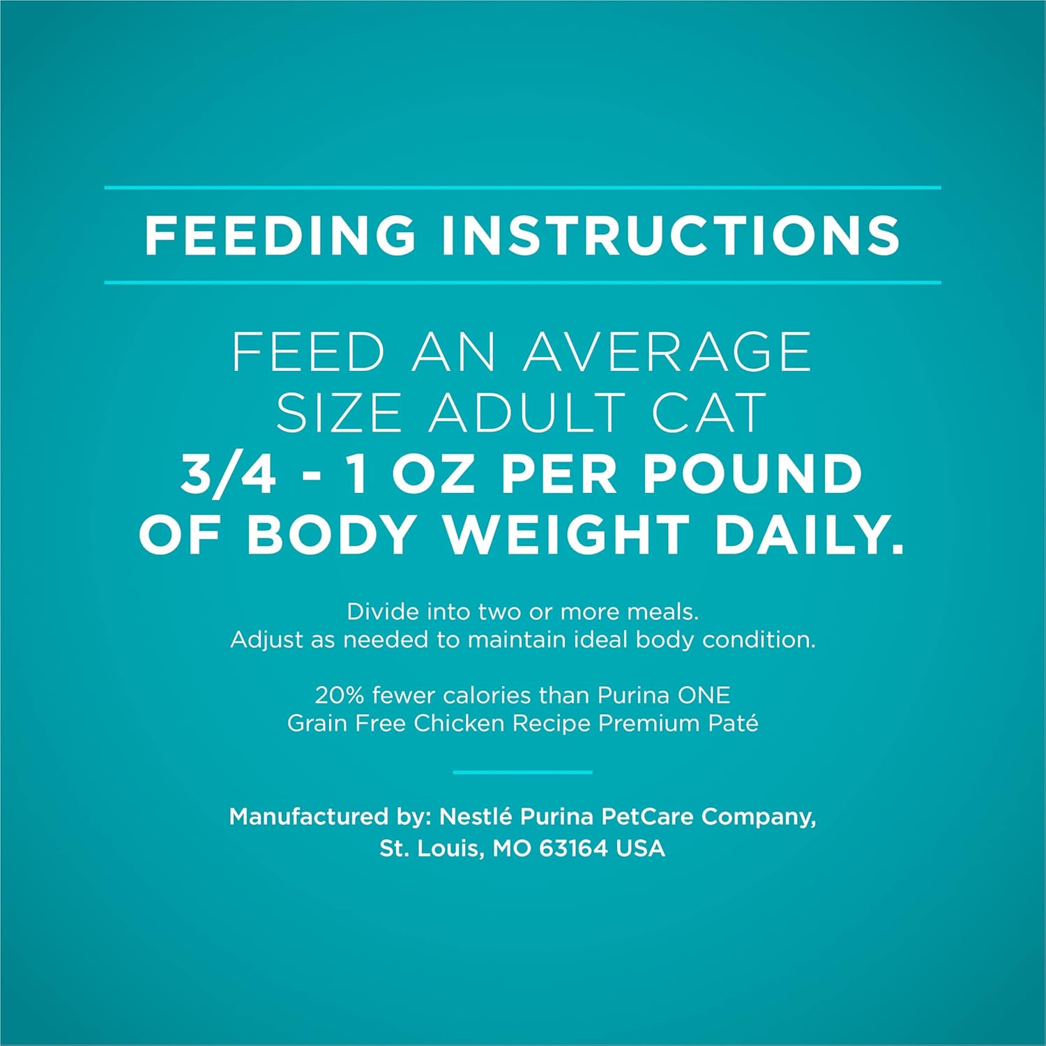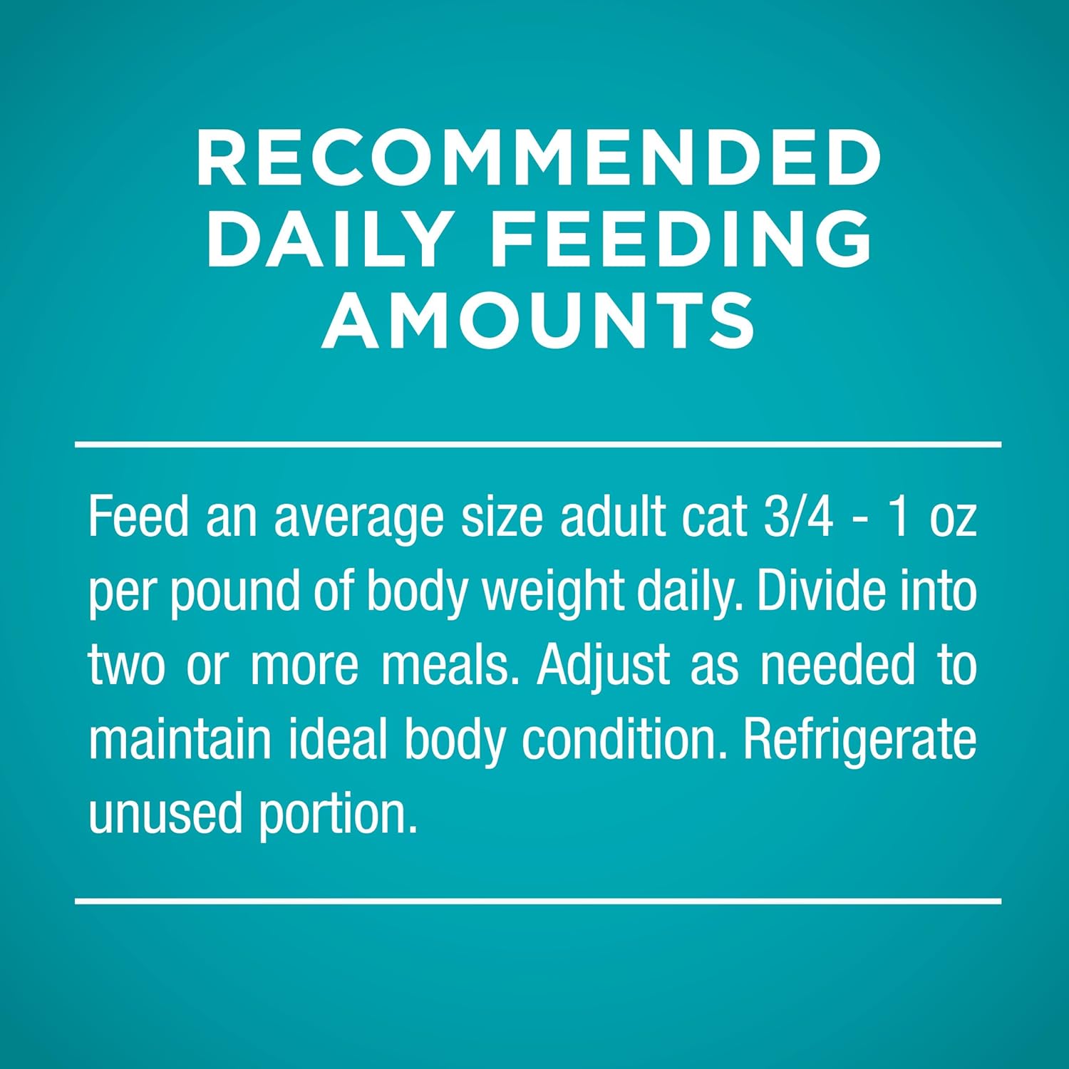 - Directions: Daily Feeding Guide Feed an average size adult cat 1-1 1/4 oz. per pound of body weight daily. Divide into two or more meals. Adjust as needed to maintain ideal body condition.