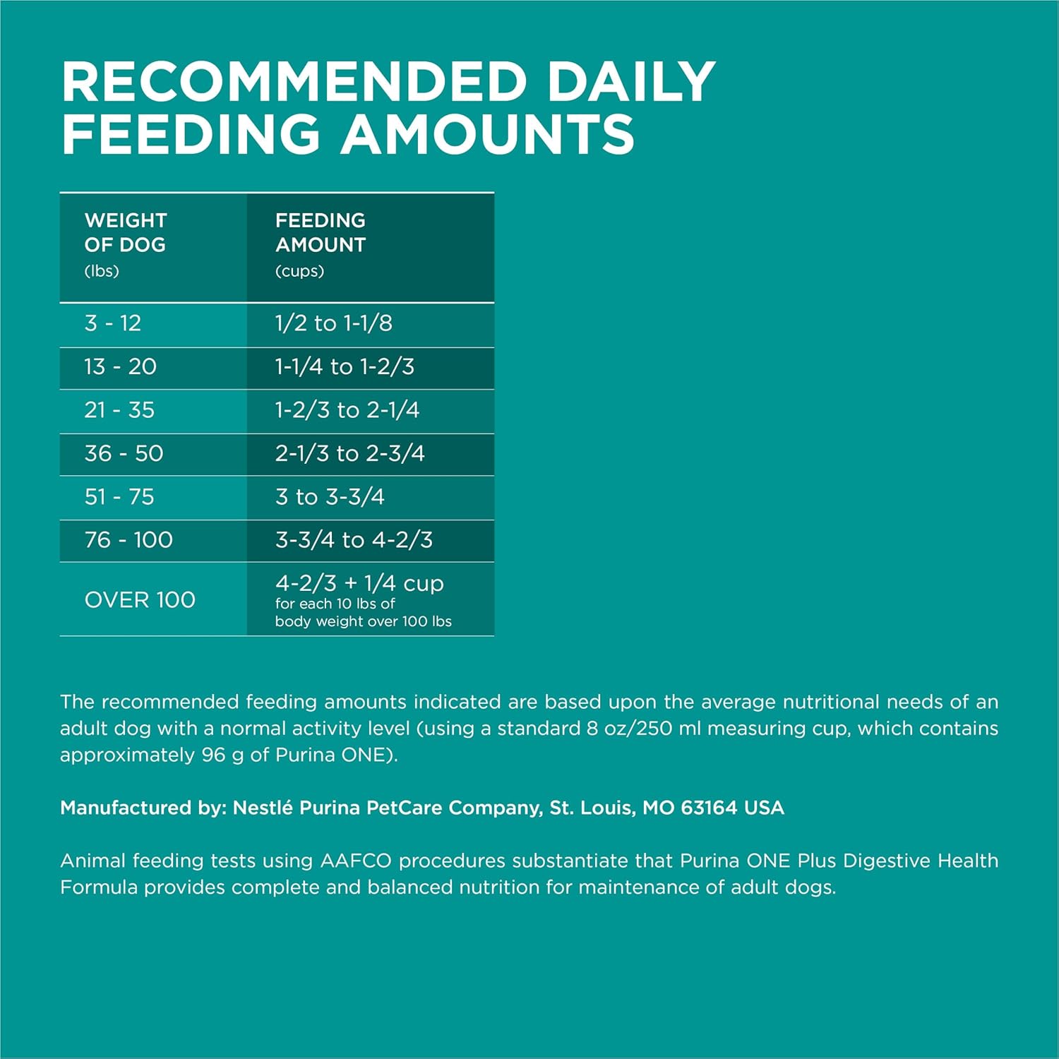 - Directions: ADULT DOG FEEDING INSTRUCTIONS The recommended feeding amounts indicated are based upon the average nutritional needs of an adult dog with a normal activity level (using a standard 8 oz/250 ml measuring cup, which contains approximately 96 g of Purina ONE). Factors, such as a dog’s metabolism, breed size, activity level, age and whether the dog is spayed or neutered, will affect the amount of Purina ONE needed to maintain an ideal body condition. The pet experts at Purina have provided the feeding amounts indicated as a starting point. If you find that your dog is losing weight or becomes overweight when fed these amounts, please adjust accordingly. To help your dog maintain an ideal body condition, monitor your dog’s weight on a regular basis, making sure that his ribs are easily felt and his waist is visible when viewed from above. Maintaining an ideal body condition can impact your dog's lifelong health. MAKING THE SWITCH TO PURINA ONE Although you’ll be anxious to see the difference Purina ONE can make in your dog, please allow 7 - 10 days to ease the transition from his current food. Each day, simply feed a little less of the previous food and a little more Purina ONE until you’re feeding Purina ONE exclusively. This gradual transition will help avoid dietary upsets. NO SUPPLEMENTS NECESSARY Purina ONE provides 100% complete and balanced nutrition for maintenance of adult dogs. There is no need to add vitamins, minerals or other supplements, unless specifically directed by a veterinarian. FRESH WATER, PROPER DIET & VETERINARY CARE Be sure to provide fresh water in a clean container for your dog daily. Proper diet, exercise and veterinary care are the best ways to keep your dog healthy. If your dog hasn’t had a check-up in the past year, please make an appointment today.