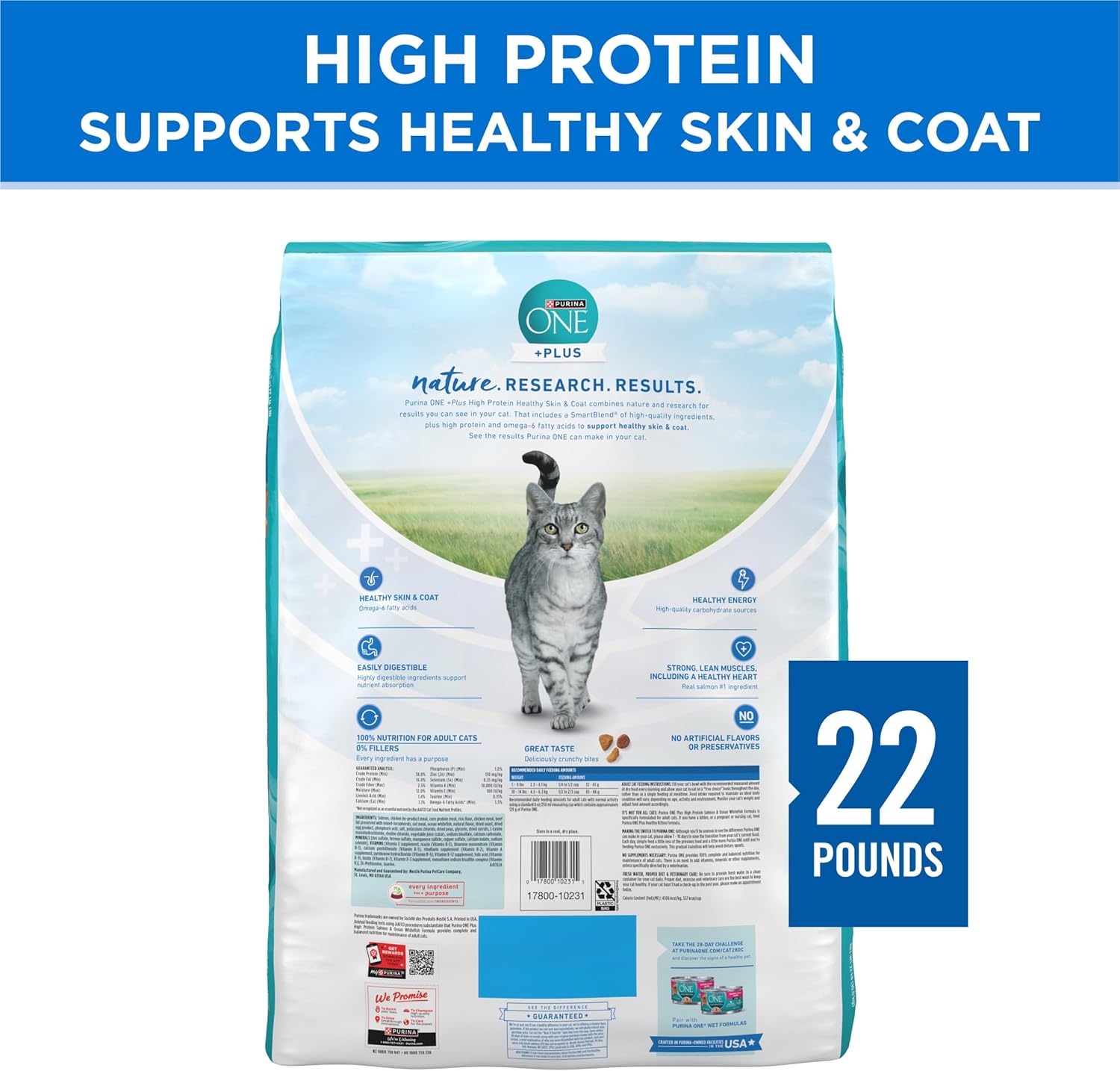 Feed your cat high protein food at mealtime, offering 38 percent protein to help support lean muscles, including a healthy heart with the Purina ONE Plus High Protein Cat Kibble Dry Food Salmon and Ocean Whitefish Skin and Coat Health Formula. Each mouthwatering serving of this high-quality cat food includes salmon as the number one ingredient with added vitamins, minerals and nutrients. This Purina ONE high protein cat food is 100 percent complete and balanced nutrition. High in omega-6 essential fatty acids for cats, this cat kibble dry food ensures that she’s getting the nutrients she needs for a healthy skin and coat. With 0 percent fillers and no artificial flavors or preservatives, this easily digestible formula ensures that your cat only gets what she needs and nothing she doesn’t. Offer your cat the nutrition her body craves in deliciously crunchy bites from the Purina ONE Plus High Protein Cat Kibble Dry Food Salmon and Ocean Whitefish Skin and Coat Health Formula.