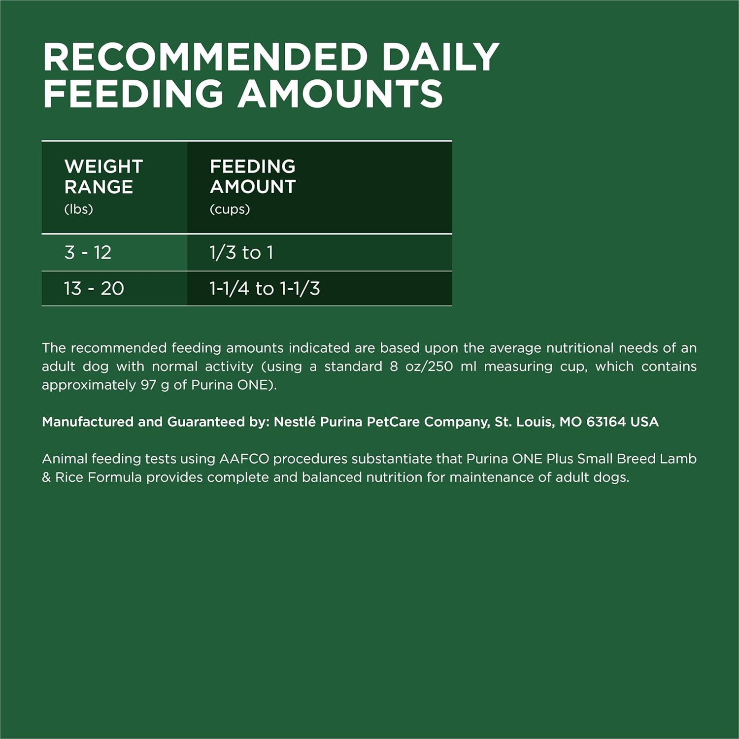 - Directions: ADULT DOG FEEDING INSTRUCTIONS The recommended feeding amounts indicated are based upon the average nutritional needs of an adult dog with normal activity (using a standard 8 oz/250 ml measuring cup, which contains approximately 99 g of Purina ONE). Factors, such as a dog’s metabolism, breed size, activity level, age and whether the dog is spayed or neutered, will affect the amount of Purina ONE needed to maintain an ideal body condition. The pet experts at Purina have provided the feeding amounts indicated as a starting point. If you find that your dog is losing weight or becomes overweight when fed these amounts, please adjust accordingly. To help your dog maintain an ideal body condition, monitor your dog’s weight on a regular basis, making sure that his ribs are easily felt and the waist is visible when viewed from above. Maintaining an ideal body condition can impact your dog’s lifelong health. MAKING THE SWITCH TO PURINA ONE Although you’ll be anxious to see the difference Purina ONE can make in your dog, please allow 7 - 10 days to ease the transition from his current food. Each day, simply feed a little less of the previous food and a little more Purina ONE until you’re feeding Purina ONE exclusively. This gradual transition will help avoid dietary upsets. NO SUPPLEMENTS NECESSARY Purina ONE provides 100% complete and balanced nutrition for maintenance of adult dogs. There is no need to add vitamins, minerals or other supplements, unless specifically directed by a veterinarian. FRESH WATER, PROPER DIET & VETERINARY CARE Be sure to provide fresh water in a clean container for your dog daily. Proper diet, exercise and veterinary care are the best ways to keep your dog healthy. If your dog hasn’t had a check-up in the past year, please make an appointment today.