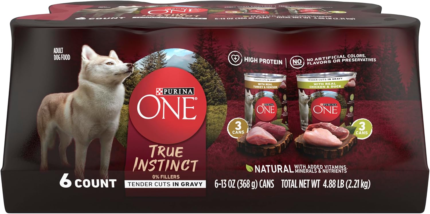 - Included Components: Six (6) 13 oz. Cans - Purina ONE Natural Gravy Wet Dog Food Variety Pack, SmartBlend True Instinct Tender Cuts