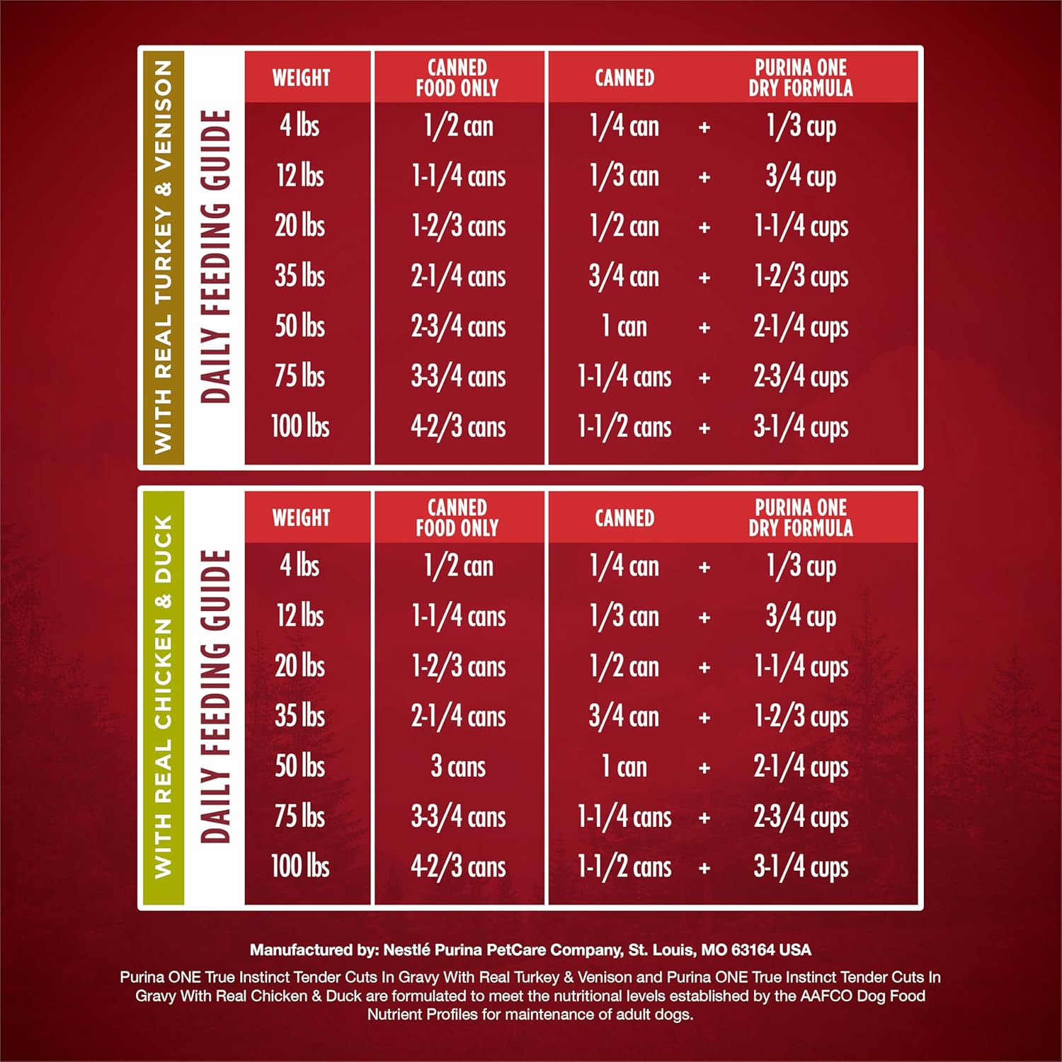 Offer your dog two tasty mealtime options with this Purina ONE Natural True Instinct Tender Cuts in Gravy adult wet dog food variety pack with added vitamins, minerals and nutrients. Both recipes feature real poultry along with other high-quality ingredients you can feel good about giving to your favorite canine. The tender, meaty texture gives him something to sink his teeth into, and a rich gravy balances out each of these delicious meals for added flavor and moisture. With 100 percent complete and balanced nutrition for your adult dog's lifelong whole-body health, this canned food for dogs is a convenient way to satisfy his nutritional needs. These high protein dog food formulas are made with no poultry by-products and no artificial flavors or preservatives. Vary your dog's meals with these two Purina ONE canned dog food entrees, including With Real Chicken and Duck and With Real Turkey and Venison, and show your dog just how much you care about his health and happiness.