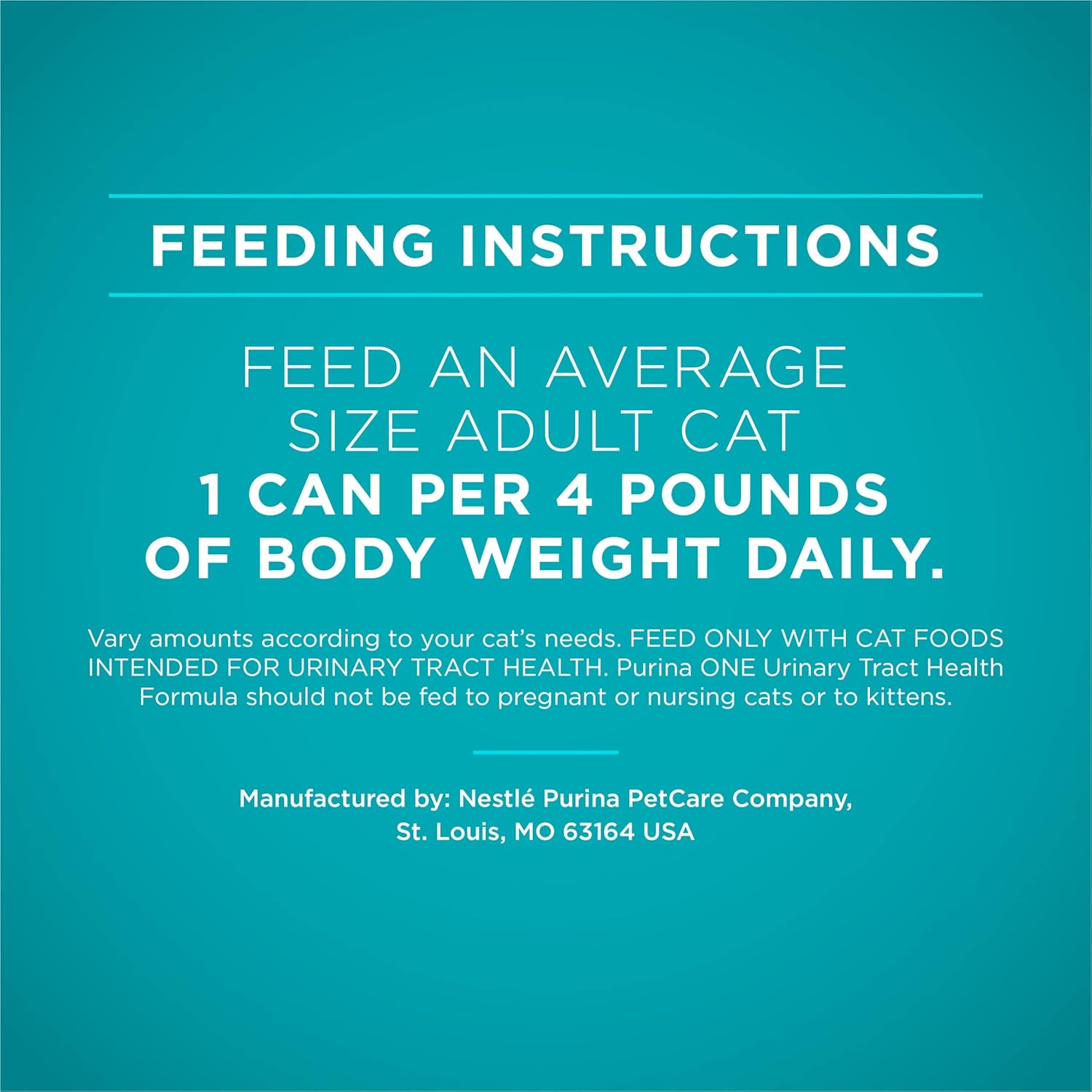 - Directions: Feed an average size adult cat 1 can per 3-1/2 pounds of body weight daily. Vary amounts according to your cat's needs. FEED ONLY WITH CAT FOODS INTENDED FOR URINARY TRACT HEALTH. ONE Urinary Tract Health Formula should not be fed to pregnant or nursing cats or to kittens.