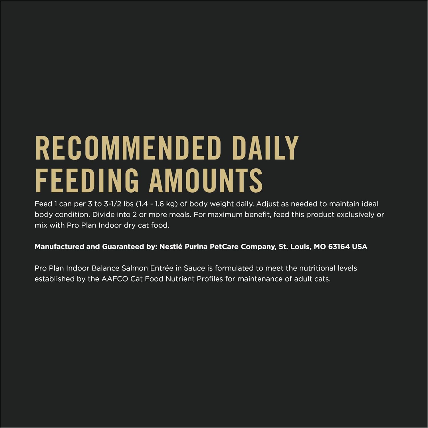 Product Description Tend to your indoor cat's specific nutritional needs with Purina Pro Plan Indoor Care Salmon and Rice Entree in Sauce adult wet cat food. This indoor cat food recipe features real salmon and rice, and every high-quality ingredient we use is selected carefully for a specific purpose. Essential moist cat food nutrients help to support your cat's digestive tract, and we formulate this moist food for cats to help her maintain a healthy weight and maintain healthy digestion. The tender inside cat food texture and delicious taste enrich her mealtime experience, and the delicate sauce adds moisture to every bite. Give your faithful feline the nutrition she needs and the flavors she craves to let her natural potential shine through with this Purina Pro Plan canned cat food formula as part of her daily feeding routine, and rest easy knowing she's getting a meal backed by a brand you can trust. Review PURINA PRO PLAN MONEY BACK GUARANTEED We guarantee outstanding quality and taste. If for any reason you’re not satisfied with our product, please let us know why. You must include: a brief explanation of why you were dissatisfied your original receipt with the price circledthe “BEST IF USED BY” date from the packaging for Wet foods, the UPC for Dry foods, the Weight Circle your name your street address (a PO Box will not be accepted)Send within 60 days of the purchase date on your receipt to: Pro Plan Satisfaction Guarantee Office of Consumer Affairs P.O. Box 1326 Wilkes-Barre, PA 18703