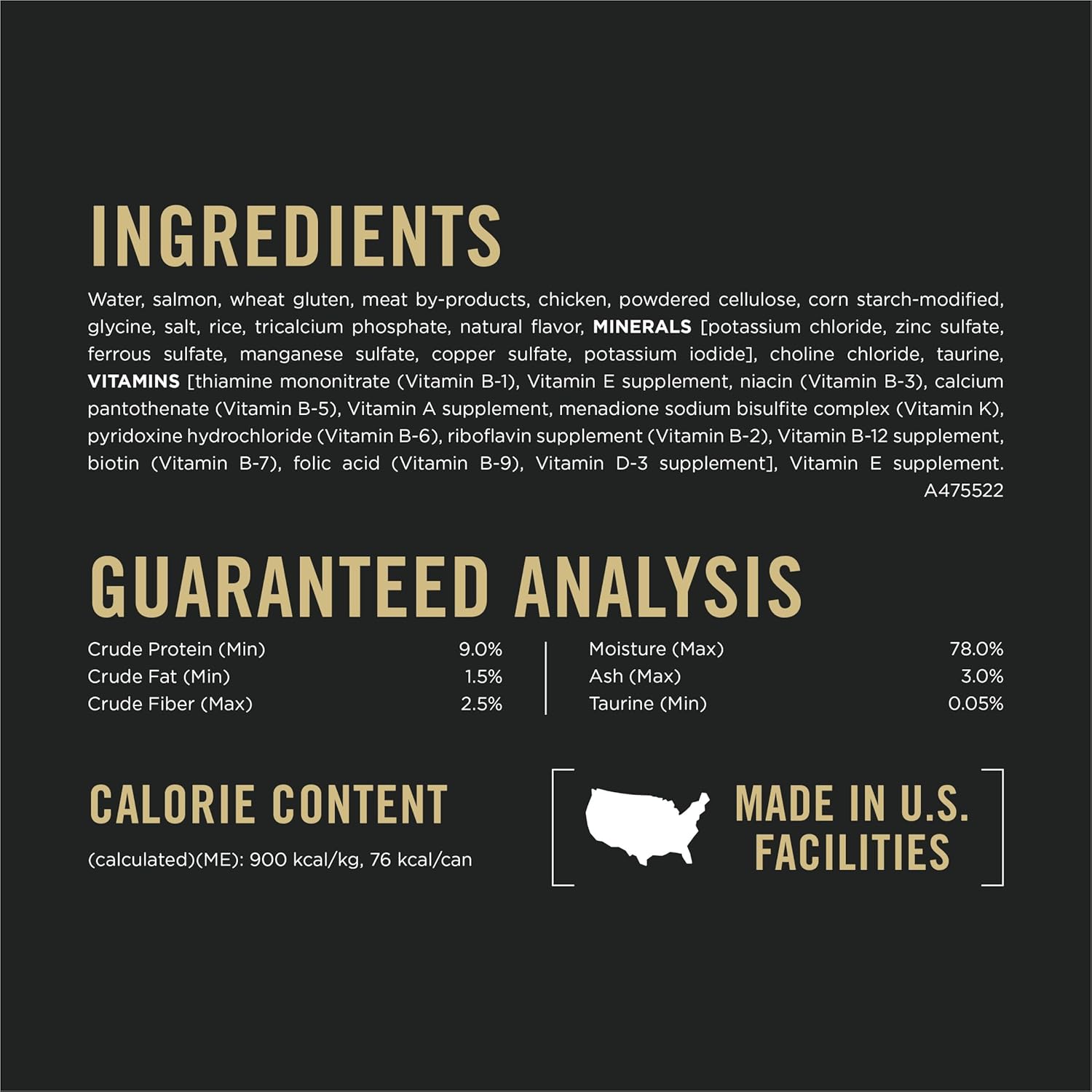 Crude Protein (Min)...12.0%, Crude Fat (Min)...2.0%, Crude Fiber (Max)...0.9%, Moisture (Max)...78.0%, Ash (Max)...3.0%, Taurine (Min)...0.05%. - Model Name: PRPN Adt Indr Smn Ri Sce CndC