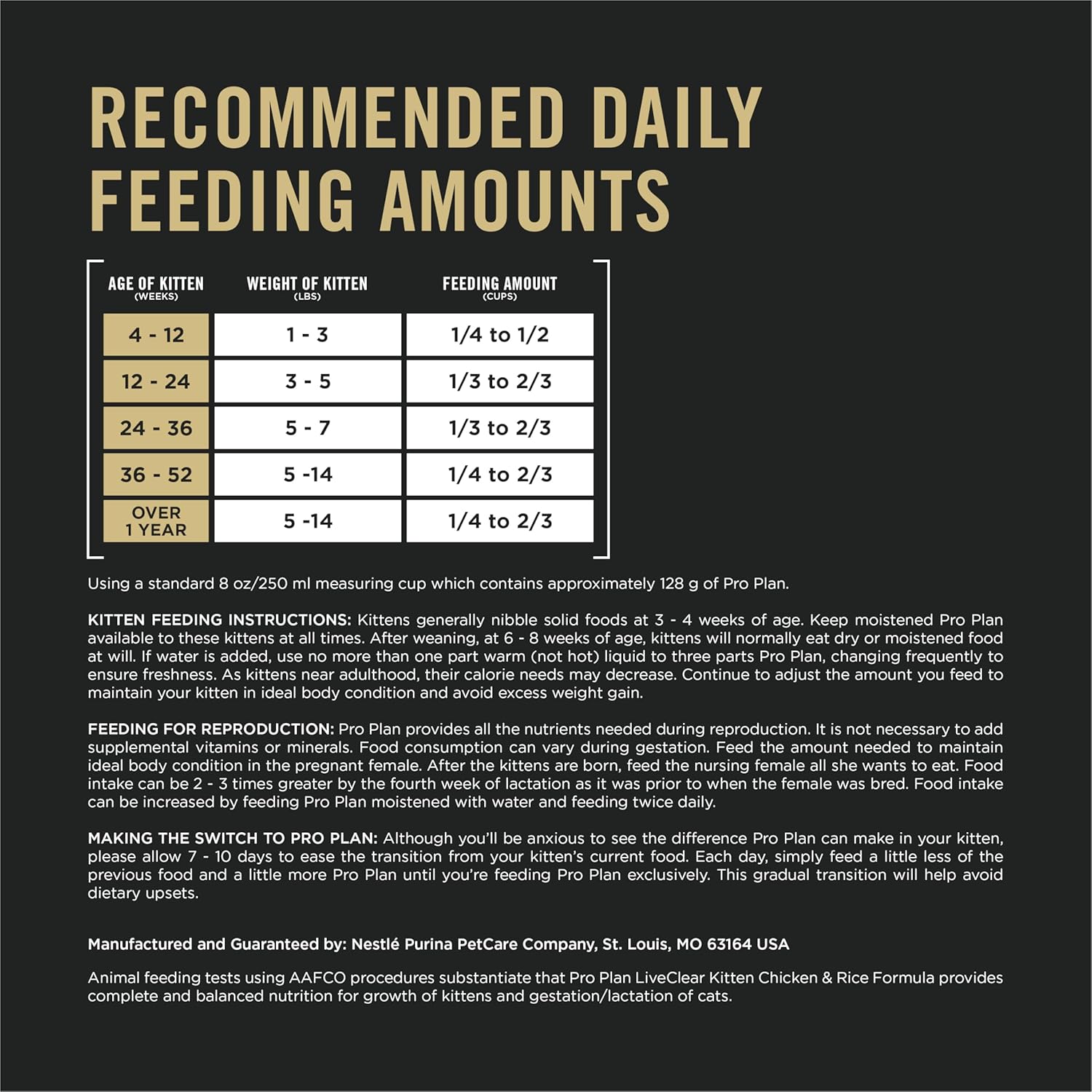 - Directions: Using a standard 8 oz/250 ml measuring cup which contains approximately 128 g of Pro Plan. KITTEN FEEDING INSTRUCTIONS Kittens generally nibble solid foods at 3 - 4 weeks of age. Keep moistened Pro Plan available to these kittens at all times. After weaning, at 6 - 8 weeks of age, kittens will normally eat dry or moistened food at will. If water is added, use no more than one part warm (not hot) liquid to three parts Pro Plan, changing frequently to ensure freshness. As kittens near adulthood, their calorie needs may decrease. Continue to adjust the amount you feed to maintain your kitten in ideal body condition and avoid excess weight gain. FEEDING FOR REPRODUCTION Pro Plan provides all the nutrients needed during reproduction. It is not necessary to add supplemental vitamins or minerals. Food consumption can vary during gestation. Feed the amount needed to maintain ideal body condition in the pregnant female. After the kittens are born, feed the nursing female all she wants to eat. Food intake can be 2 - 3 times greater by the fourth week of lactation as it was prior to when the female was bred. Food intake can be increased by feeding Pro Plan moistened with water and feeding twice daily. MAKING THE SWITCH TO PRO PLAN Although you'll be anxious to see the difference Pro Plan can make in your kitten, please allow 7 - 10 days to ease the transition from your kitten's current food. Each day, simply feed a little less of the previous food and a little more Pro Plan until you're feeding Pro Plan exclusively. This gradual transition will help avoid dietary upsets. Contains a source of live (viable) naturally occurring microorganisms. Provide adequate fresh water in a clean container daily. For your pet's health, see your veterinarian regularly.
