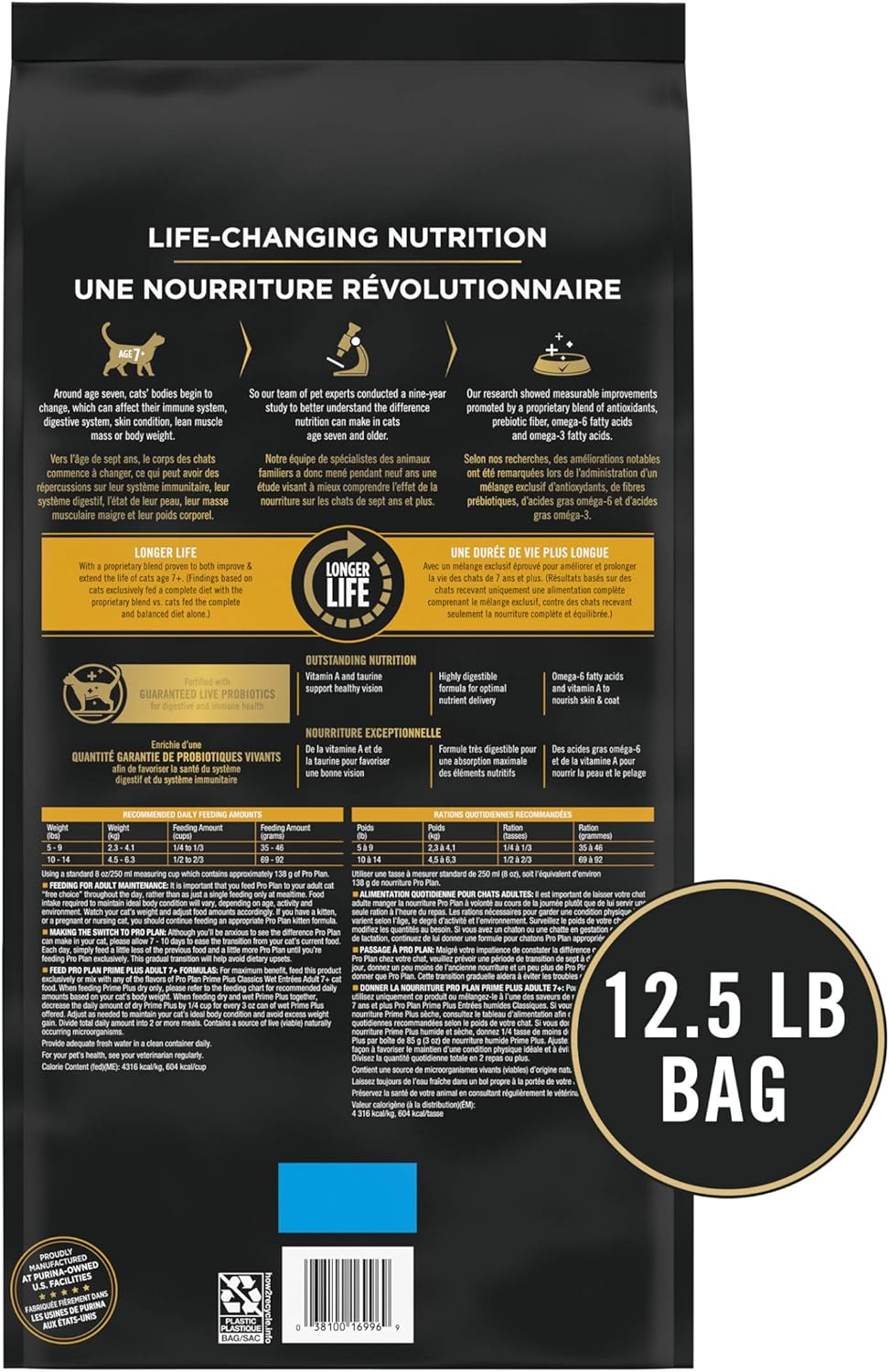 - Directions: Feed Pro Plan Prime Plus Adult 7+ Chicken & Rice Formula For maximum benefit, feed this product exclusively or mix with any of the flavors of Pro Plan Prime Plus Classics Wet Entrees Adult 7+ cat food. When Feeding Prime Plus dry only, please refer to the feeding chart for recommended daily amounts based on your cat's weight. When feeding dry and wet Prime Plus together, decrease the daily amount of dry Prime Plus by 1/4 cup for every 3 oz. can of wet Prime Plus offered. Adjust as needed to maintain your cat's ideal body condition and avoid excessive weight gain. Divide total daily amount into 2 or more meals. For your pet's health, see your veterinarian regularly. Feeding for Adult Maintenance It is important that you feed Pro Plan to your adult cat "free choice" throughout the day, rather than just as a single feeding only at mealtime. Food intake required to maintain ideal body condition will vary, depending on age, activity and environment. Watch your cat's weight and adjust food amounts accordingly. If you have a kitten, or a pregnant or nursing cat, you should continue feeding Pro Plan Kitten Chicken & Rice Formula. Making the Switch to Pro Plan Although you'll be anxious to see the difference Pro Plan can make in your cat, please allow 7(en)10 days to ease the transition from your cat's current food. Each day, simply feed a little less of the previous food and a little more Pro Plan until you're feeding Pro Plan exclusively. This gradual transition will help avoid dietary upsets. Provide adequate fresh water in a clean container daily. Store in a cool, dry place.