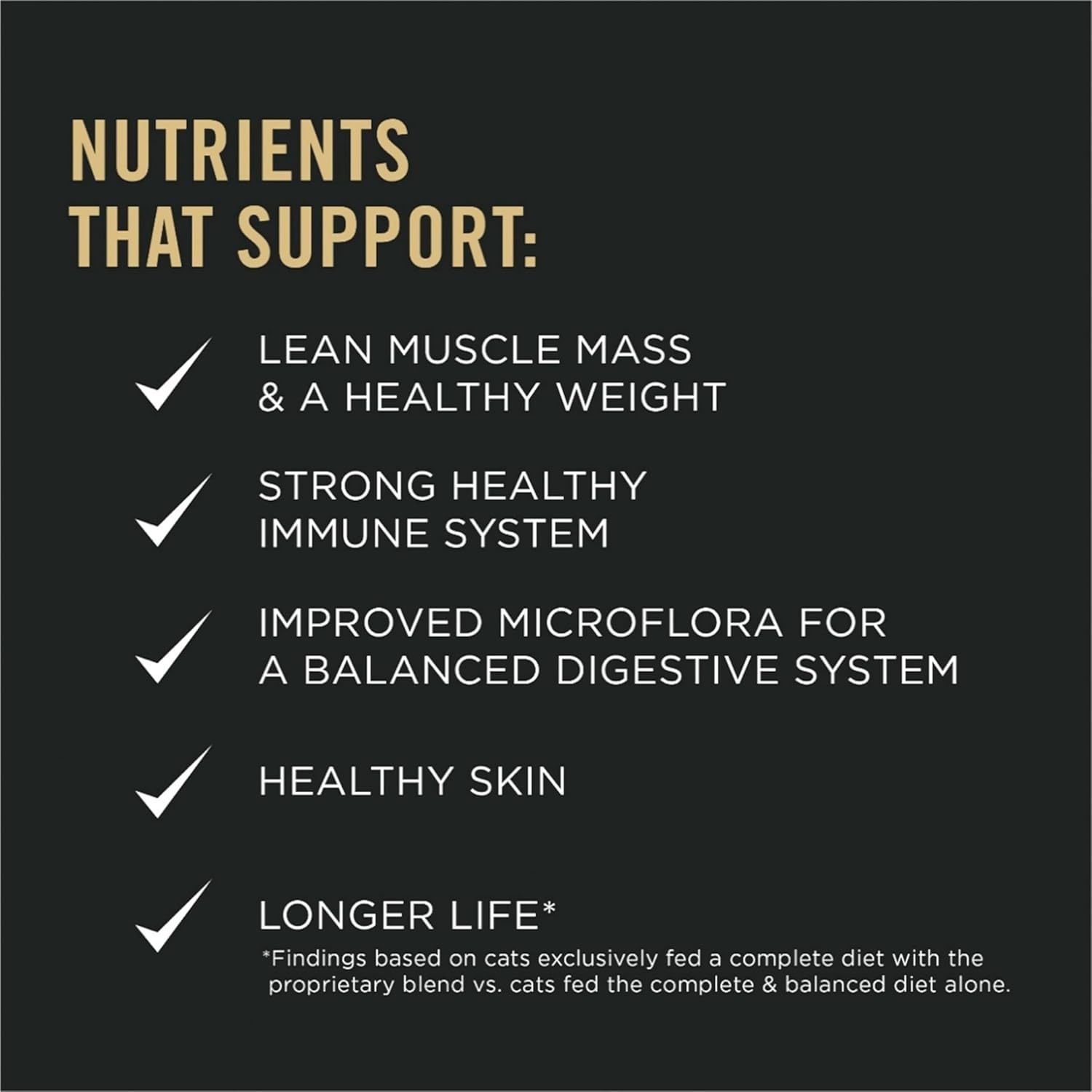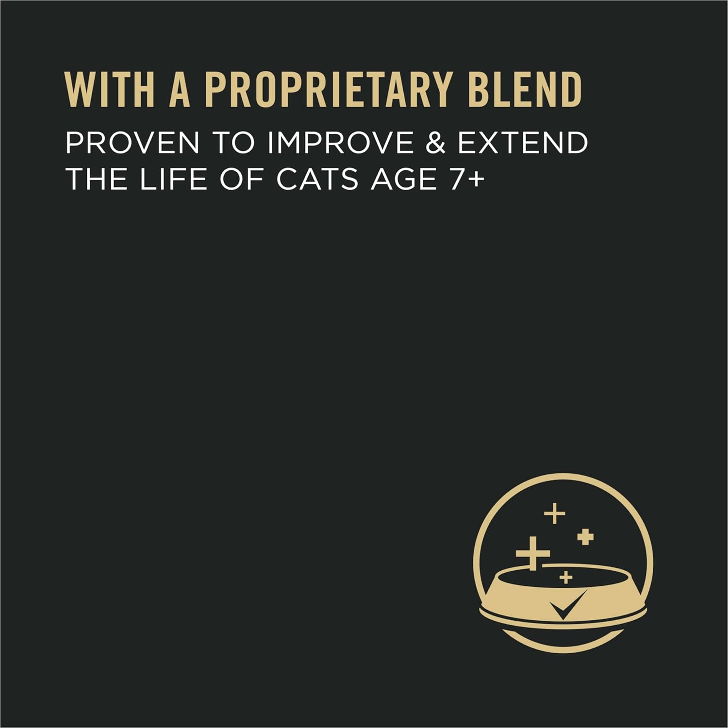 Keep your senior cat happy with Purina Pro Plan Brand Cat Food SENIOR Adult 7+ Chicken and Rice Formula dry cat food. This senior cat food contains a unique blend that has been proven in a nine-year study to improve and extend the lives of cats age 7+. Findings are based on cats exclusively fed a complete diet with the proprietary blend vs. cats fed the complete and balanced diet alone. This high-protein cat food also promotes lean muscle mass and helps maintain a healthy weight. Real chicken is the first ingredient in our Chicken and Rice cat food formula which provides balanced nutrition that helps your senior cat thrive. Plus, it includes the antioxidants beta carotene and vitamin E, omega-3 fatty acids from fish oil, and omega-6 fatty acids from soybean oil. The key nutrients in this Purina dry cat food help support your cat's immune system and improve the microflora in her stomach to help maintain a balanced digestive system and support your favorite feline's healthy skin.