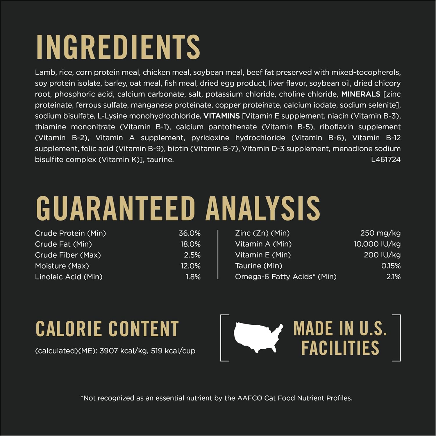 Product Description Tend to your cat's unique nutritional needs with Purina Pro Plan Brand Cat Food Sensitive Skin and Stomach Lamb and Rice Formula adult dry cat food. This sensitive stomach cat food features real lamb as the first ingredient, and every ingredient is carefully chosen for a specific purpose. We formulate our high-protein cat food with easily digestible rice and oatmeal, which are gentle on her digestive system. Each serving is also fortified with guaranteed live probiotics to support her digestive and immune health, and omega-6 fatty acids and vitamin A nourish her skin and coat. Plus, this sensitive skin cat food kibble is made without artificial colors or flavors, so your cat gets the ingredients you want for her and none you don't. With 100 percent complete and balanced nutrition, our super-premium adult cat food lets you give her the nourishment she needs to be her best self. Make Purina cat food part of your good girl's daily feeding routine, and give her SPECIALIZED nutrition that performs. Buying Guide Crude Protein (Min)...40.0%, Crude Fat (Min)...17.0%, Crude Fiber (Max)...4.0%, Moisture (Max)...12.0%, Linoleic Acid (Min)...1.6%, Zinc (Zn)(Min)...250mg/kg, Vitamin A (Min)...10,000 IU/kg, Vitamin E (Min)...400 IU/kg, Taurine (Min)...0.15%, Omega-6 Fatty Acids* (Min)...2.3%. *Not recognized as an essential nutrient by the AAFCO Cat Food Nutrient Profiles.