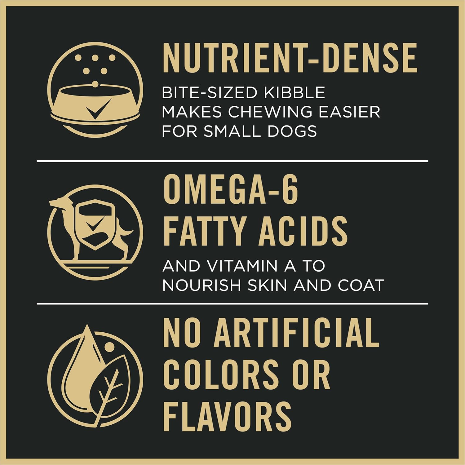 Fuel your little dog's oversized appetite with Purina Pro Plan SPECIALIZED Small Breed Shredded Blend Beef and Rice Formula adult dry dog food. We craft this nutrient-dense adult dog food by choosing ingredients with a purpose, including real beef as the number 1 ingredient to meet the needs of highly active small dogs. With crunchy kibble and tender shreds it's easy to chew, and the formula's natural prebiotic fiber nourishes specific intestinal bacteria for dog digestive health. With guaranteed live probiotics for digestive and immune health, this shredded dog food is highly digestible for optimal nutrient delivery. As part of the 100 percent complete and balanced dog food formula for adult dogs under 20 pounds, this high protein dry dog food contains calcium, phosphorus and other minerals to help maintain strong bones and teeth, minus artificial colors or flavors. Omega-6 fatty acids and vitamin A in our dry dog food for small dogs nourish his skin and coat.