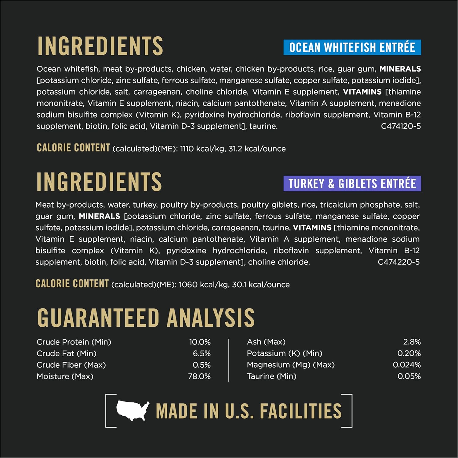- Included Components: Twelve (12) 5.5 oz. Cans - Purina Pro Plan Urinary Tract Cat Food, Wet Cat Food Variety Pack, Turkey and Ocean Whitefish Entrees