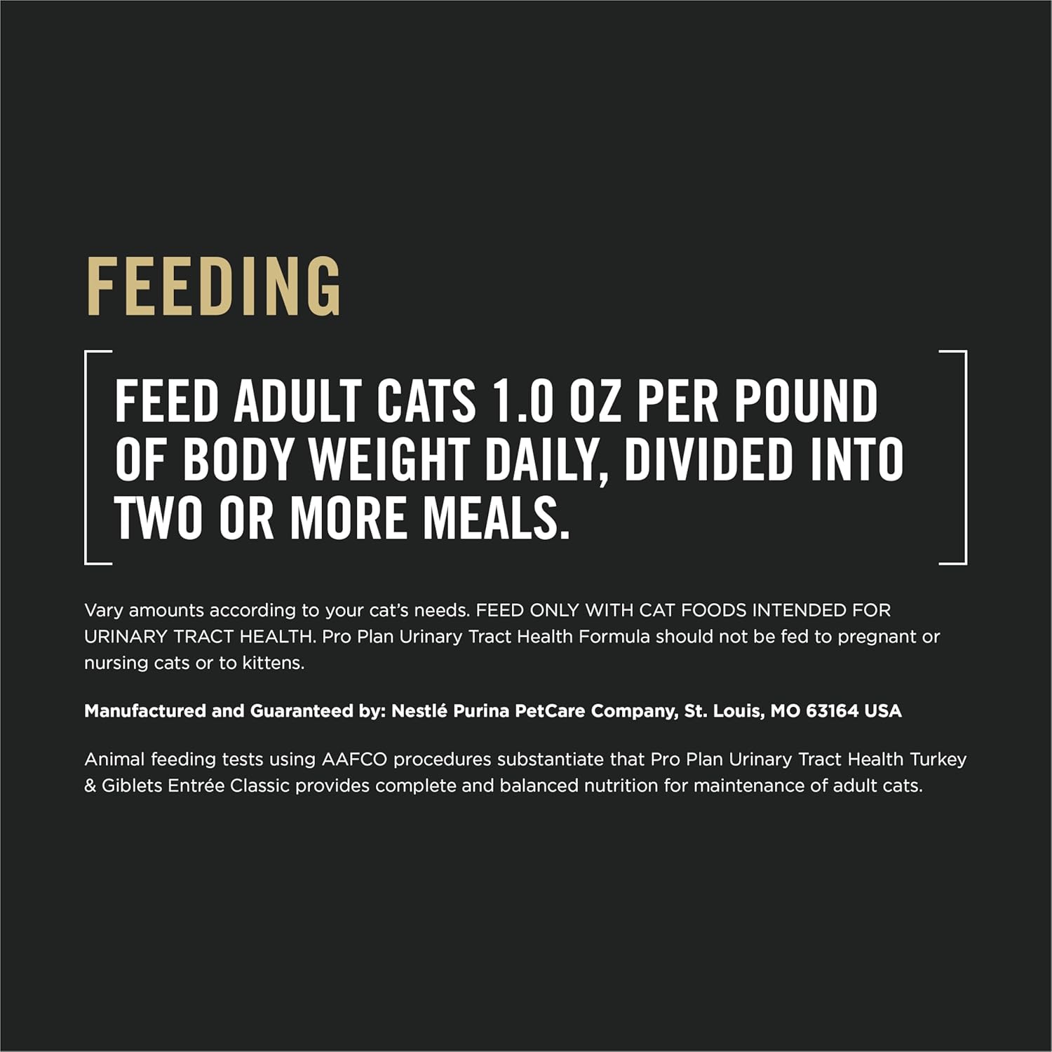 - Directions: Feed adult cats 1.0 oz per pound of body weight daily, divided into two or more meals. Vary amounts according to your cat's needs. FEED ONLY WITH CAT FOODS INTENDED FOR URINARY TRACT HEALTH. Pro Plan Urinary Tract Health should not be fed to pregnant or nursing cats or to kittens.