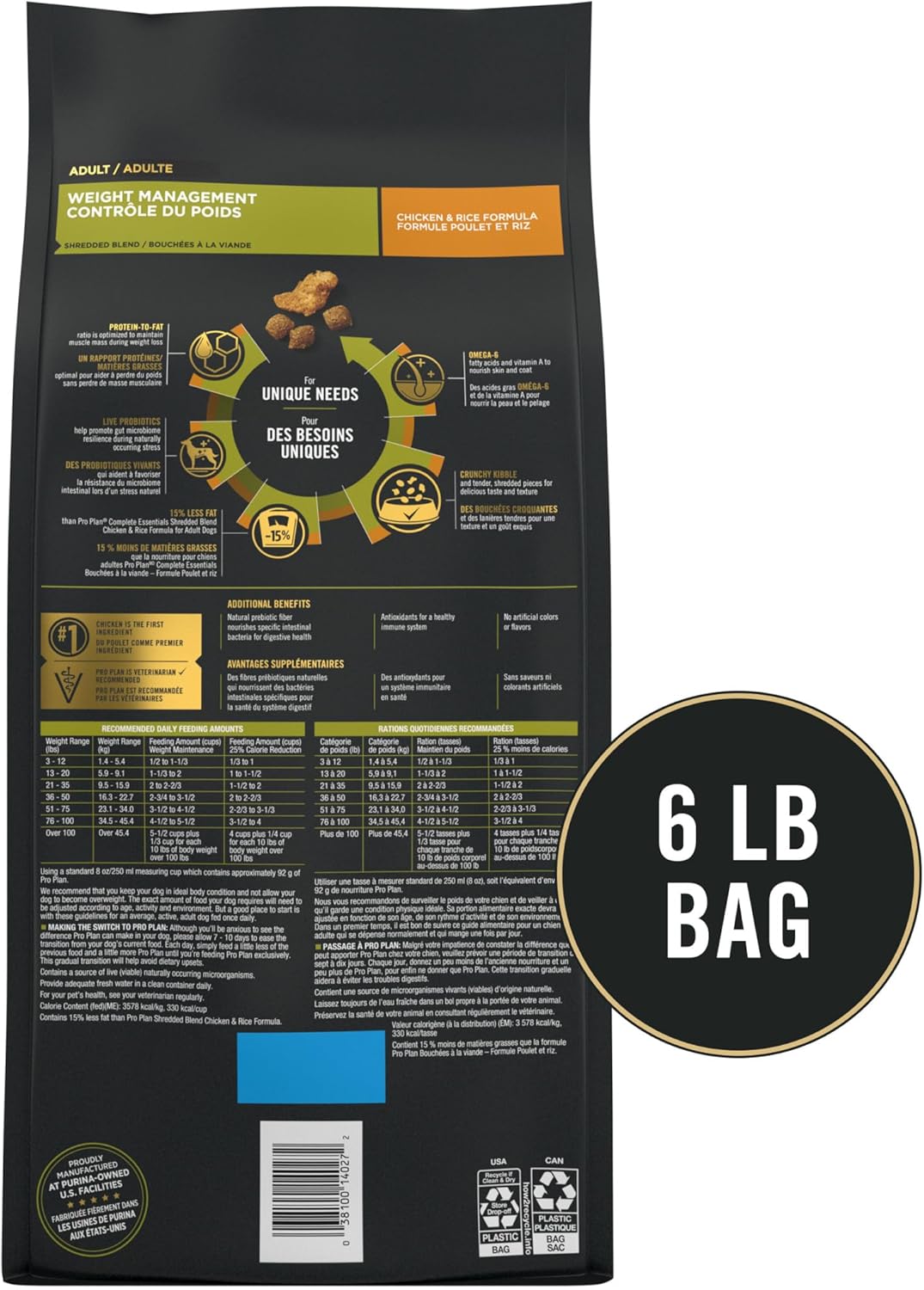 Combine great taste and health consciousness with Purina Pro Plan Brand Dog Food Shredded Blend Weight Management Chicken and Rice Formula adult dry dog food. This high-quality weight management dog food with real chicken as the first ingredient helps deliver the nutrition he needs and the savory flavor he loves, while the combination of hard dog food kibble and tender shredded pieces keeps him engaged. With 15 percent less fat than our Pro Plan ESSENTIALS Shredded Blend Chicken and Rice Formula for Adult Dogs, this dry dog food gives your dog a meal you can feel good about serving. The natural prebiotic fiber nourishes the beneficial bacteria in your dog's intestinal tract, working to maintain a good balance, and guaranteed live probiotics help support his digestive health. With 100 percent complete and balanced nutrition and high-quality ingredients in every serving, this Purina Pro Plan SPECIALIZED weight control dog food formula gives your adult dog a mouthwateringly healthy meal.