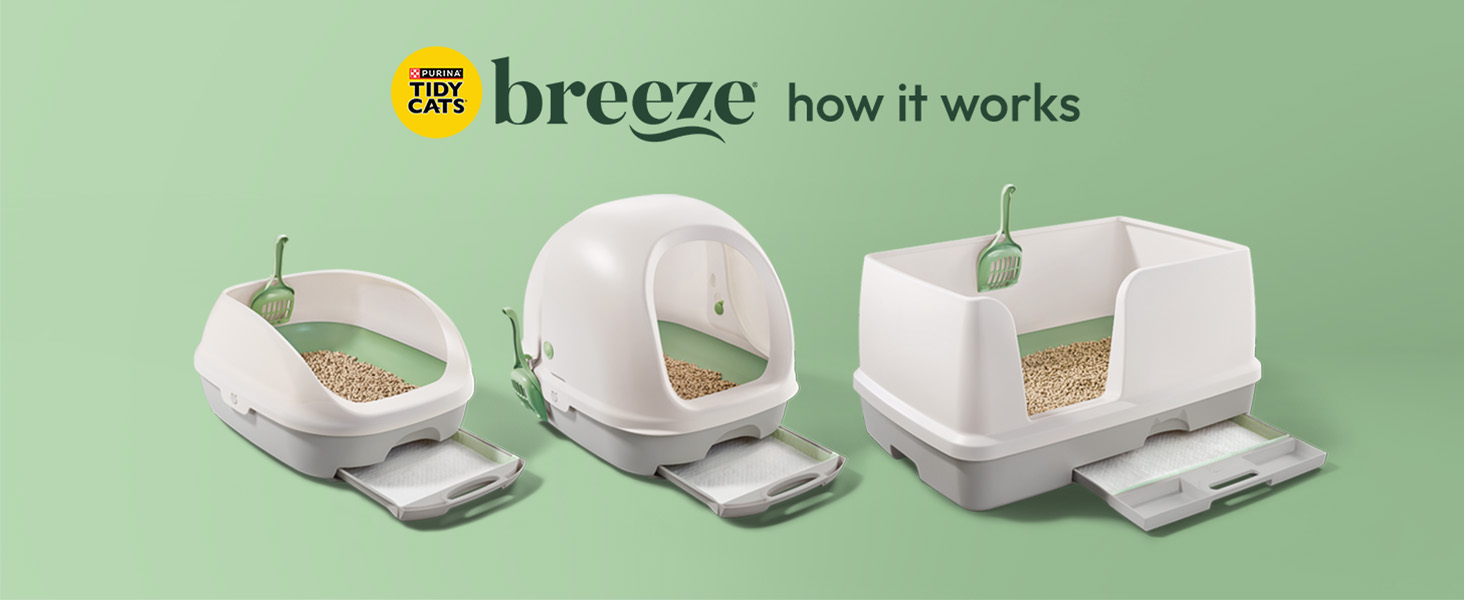 - Directions: Transitioning Your Cats Successfully 1. Set up your new BREEZE Litter System next to your current litter box. If you don't currently use a litter box with high sides or a top, remove the BREEZE sidewall for now. 2. Move some clumps and solid waste from your current box to the clean BREEZE system. This will help your cats recognize their new bathroom. Once they start using the BREEZE box, you can remove the clumps and solid waste. 3. Stop cleaning the old litter box. Cats like clean, so make the new BREEZE box the most appealing option by not scooping the old box. Sounds gross, but this step is key to a successful transition. 4. Toss out that old box completely once your cats have started using the BREEZE system for all of their potty needs. Expert Tips Be patient. BREEZE Litter System is very different from traditional litter boxes, and some cats may take longer than others to make the switch. • Don't force your cats into the BREEZE box as this could frighten them. Let them explore on their own. It's important they make the choice to use it. • Set up BREEZE right beside their previous box. Putting it in the same location helps minimize the change your cats are experiencing. • Give your cats space. Let them explore the new box on their own. Even cats prefer a little privacy when they are doing their business! Animal behaviorists recommend multiple cat households have multiple litter boxes one system per cat, plus one additional system (2 cats = 3 litter systems). Simple Setup and Maintenance 1. Snap the sidewall onto the grated base. 2. Place a cat pad (soft side up) in the BREEZE litter system drawer and side into the base 3. Fill the top portion of the box with one package of litter pellets. 4. Scoop out solid waste and dispose of daily. Note Pellets do not clump. 5. Add more pellets as needed. We recommend that you replace the pellets completely once a month. 6. Slide drawer out to replace disposable pad. Drawer can be rotated without touching the pad to extend pad life.