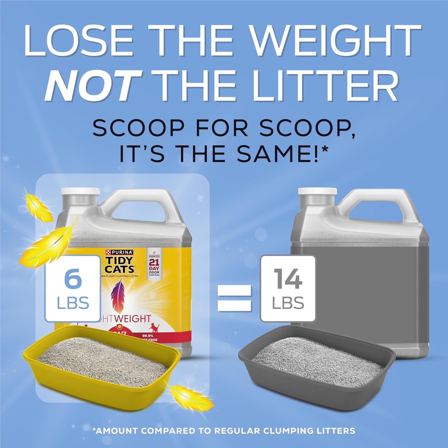 Lighten your kitty litter load while maintaining your cats' litter boxes with Purina Tidy Cats LightWeight 24/7 Performance clumping litter. This Tidy Cats scented litter contains triple-odor protection to work against strong smells and leaves behind a fresh, clean linen scent. The lightweight kitty litter formula weighs half as much as the leading clumping cat litter, making it easy to carry, pour and store. With an added Ammonia Blocker that keeps ammonia odor from forming for 14 days when used as directed, this odor control cat litter provides protection from lingering cat litter box smells all day and all night. The strong, tight clumps make scooping easier, so litter box cleaning is simple and speedy, and the slow-release deodorizing system delivers continuous odor control. Plus, our low dust cat litter formula provides a clean and easy pour to make refills more pleasant. Fill your cats' boxes with powerful odor control, and give them a Tidy place to call their own.