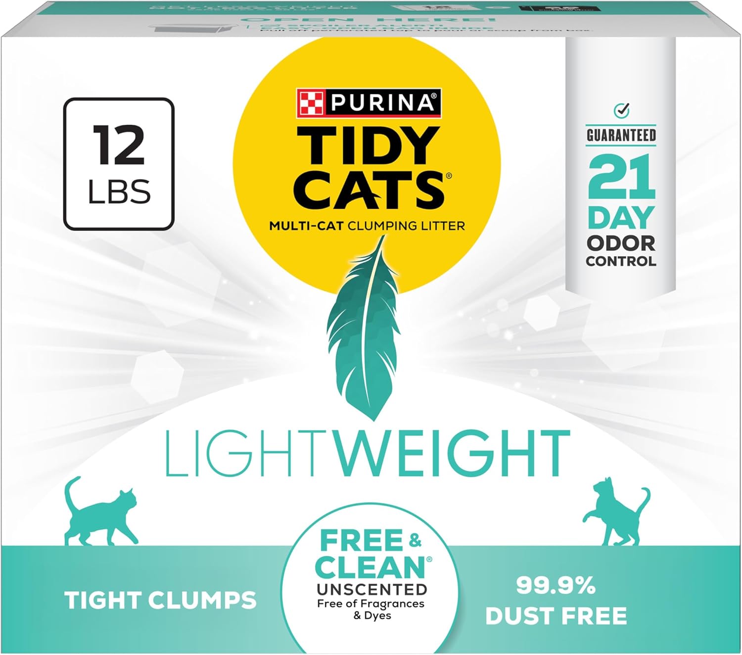 Conquer litter box maintenance without the pain of litterback with Purina Tidy Cats LightWeight Free and Clean Unscented Cat Litter. This multi cat litter prevents ammonia odor for 21 days (when used as directed) while remaining free from dyes and fragrances—perfect for sensitive noses. Tidy Cats unscented litter is easy to carry, weighing half as much as the leading clumping cat litter while providing the same amount of litter. The low dust cat litter is easy to use and is 99.9 percent dust free and forms strong, tight clumps for quick and easy scooping and effortless litterbox maintenance. A good option for multi cat families, put this powerfully absorbent Tidy Cats litter into every cat litter box and make each one a welcoming place for your cats. Add Purina Tidy Cats LightWeight Free and Clean Clumping cat litter odor control to your cat’s litter box for the great formula you love and the performance and odor control you expect at a fraction of the weight.