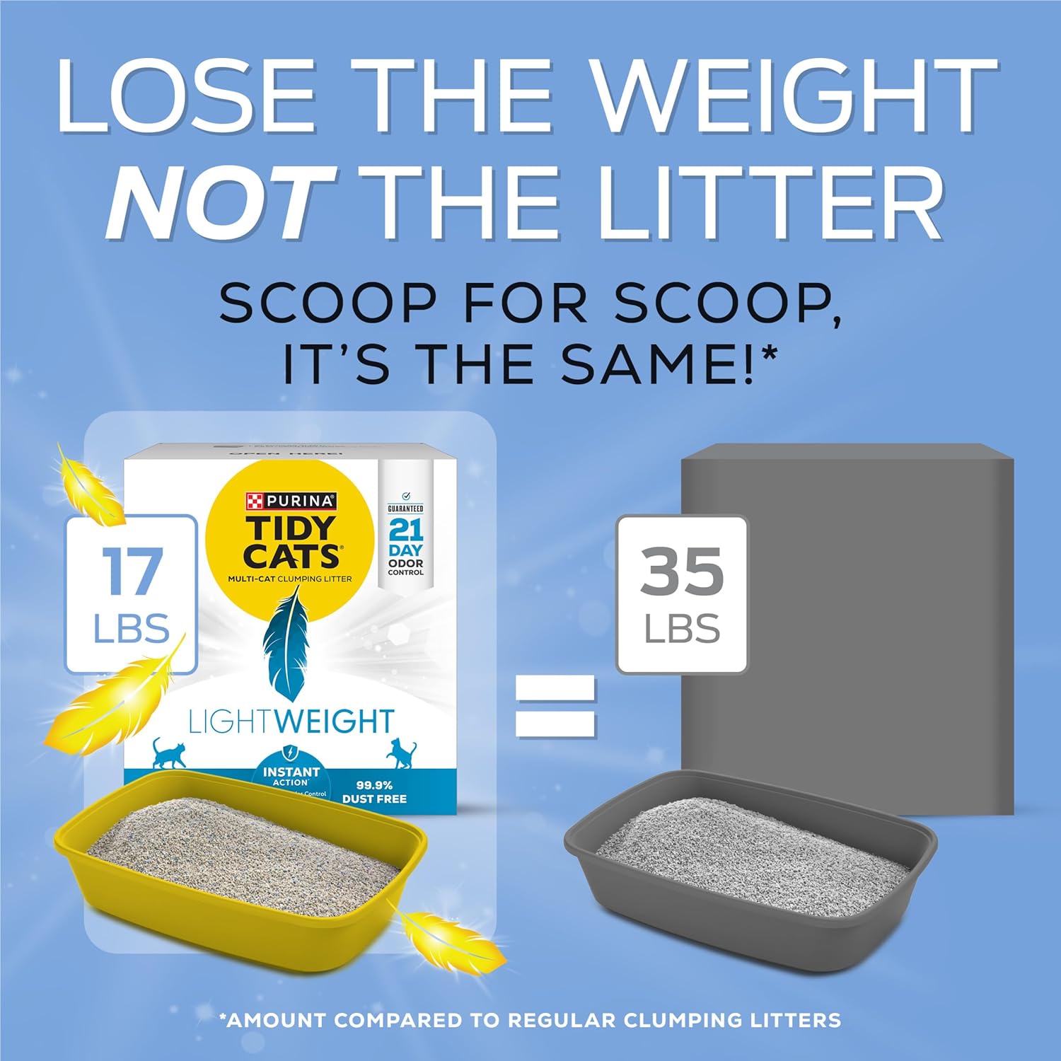 Conquer litter box maintenance without the pain of litterback with Purina Tidy Cats LightWeight Instant Action clumping, scoopable cat litter. With an innovative formula that traps and prevents ammonia odor for 21 days (when used as directed), this multi cat litter offers protection at a fraction of the weight of regular litter without sacrificing litter amount. Tidy Cats litter defends your home against strong smells from the litter box with immediate odor control that helps maintain an inviting, fresh-smelling home. The lightweight litter is easy to carry, weighing 50 percent less than the leading clumping cat litter and provides a clean and easy pour. The low dust cat litter is 99.9 percent dust free and forms strong, tight clumps for quick and easy scooping, while every patented granule features immediate odor control with powerful absorbency and tight clumping. Give your cats days of odor control and a clean place to call their own with Purina Tidy Cats LightWeight Instant Action clumping, scoopable cat litter.