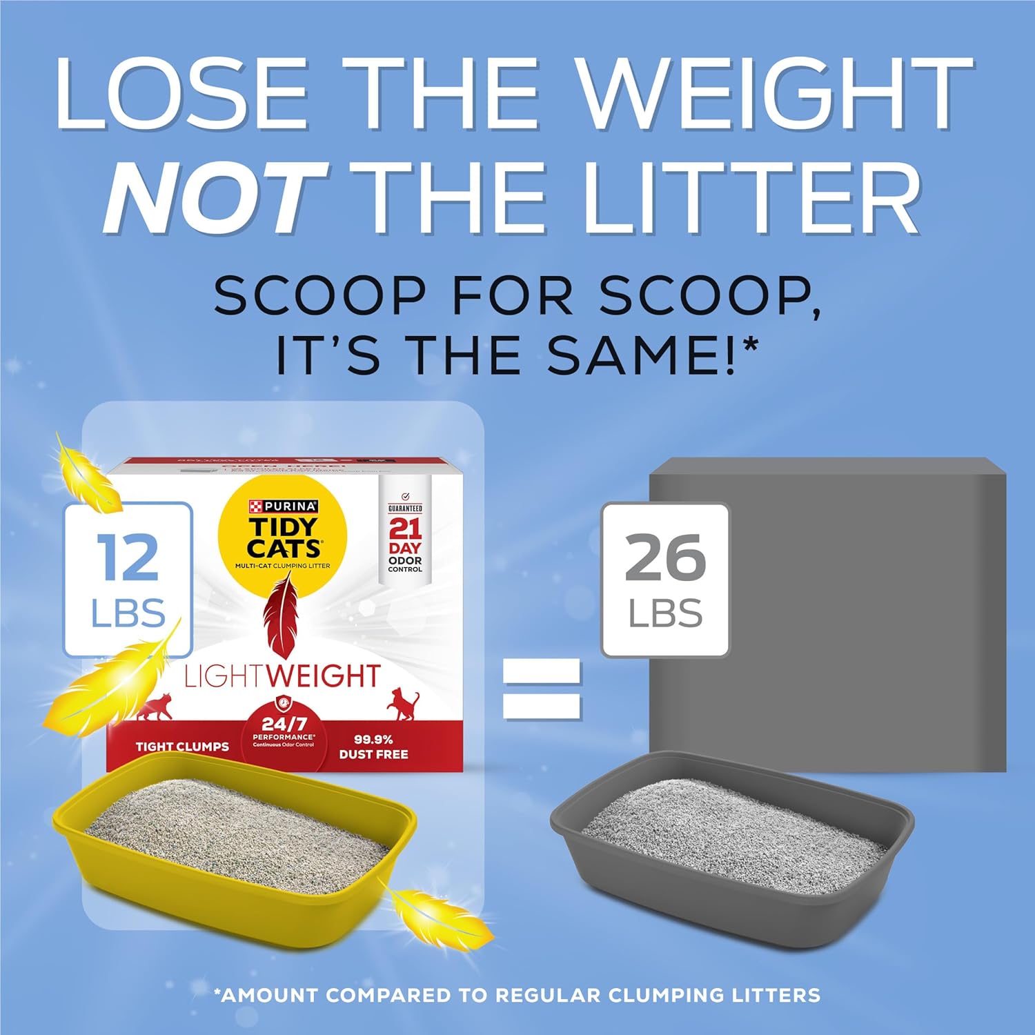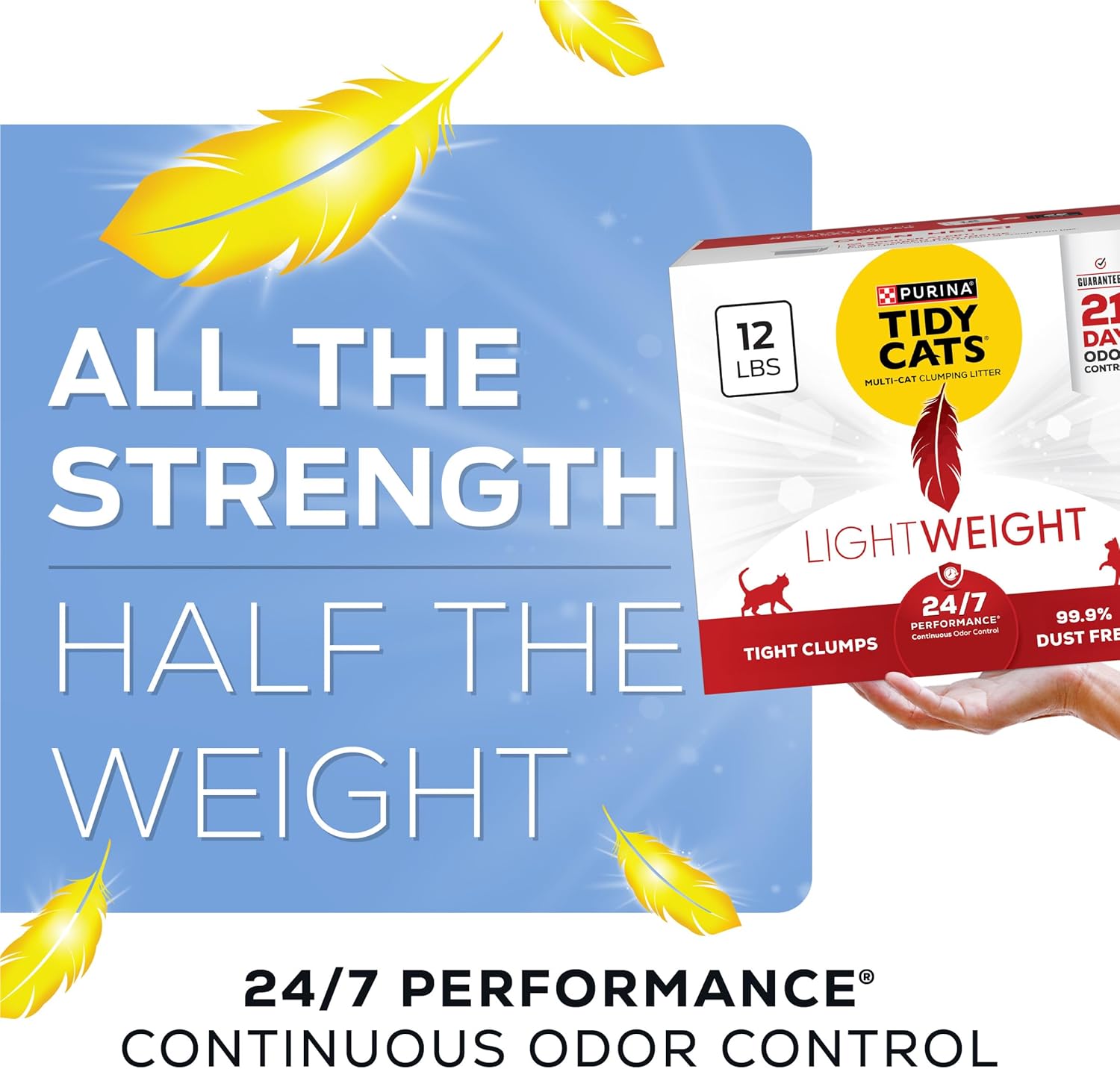 Lighten your load as you maintain your cats' litter boxes with Purina Tidy Cats LightWeight 24/7 Performance clumping cat litter. This multi cat kitty litter contains triple-odor protection to defend your home against strong smells and leaves behind a fresh, clean linen scent. This lightweight clumping litter formula weighs half as much as leading clumping kitty litter, making it so easy to carry, you feel like saying, "Toss me that litter." With an added Ammonia Blocker that keeps ammonia odor from forming for 14 days when used as directed, this odor control cat litter provides protection from lingering smells all day and all night. The strong, tight clumps allow for convenient scooping, so litter box cleaning is simple and speedy. Plus, the slow-release deodorizing system in Purina Tidy Cats LightWeight cat litter ensures continuous odor control with absorbency and clumping in every patented granule. Our low dust cat litter formula provides a clean and easy pour. Fill your cats’ boxes with around-the-clock odor control, and give them a Tidy place to call their own.
