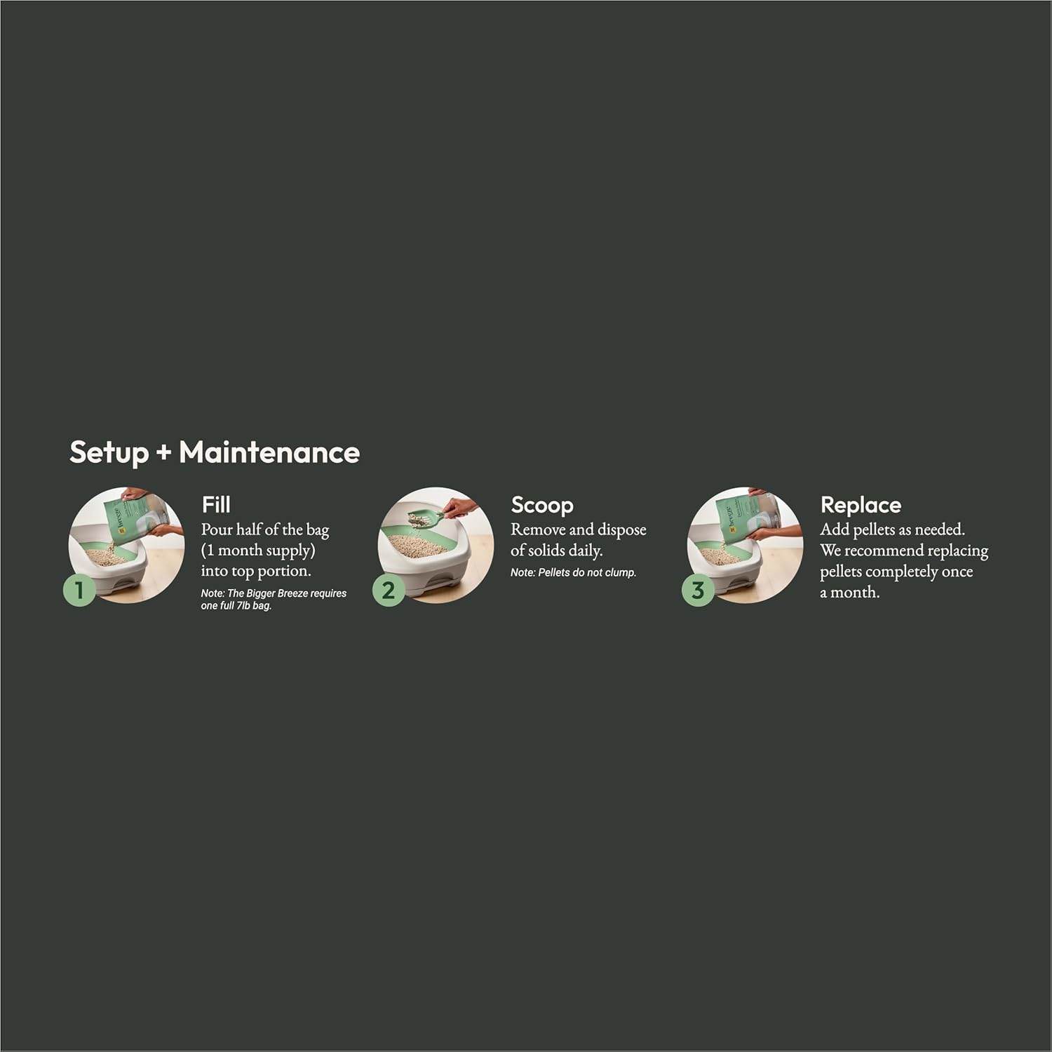 - Directions: Transitioning Your Cat Successfully 1. Set up your new BREEZE Litter System next to your current litter box. If you don't currently use a litter box with high sides or a top, remove the BREEZE sidewall for now. 2. Move some clumps and solid waste from your current box to the clean BREEZE system. This will help your cats recognize their new bathroom. Once they start using the BREEZE box, you can remove the clumps and solid waste. 3. Stop cleaning the old litter box. Cats like clean, so make the new BREEZE box the most appealing option by not scooping the old box. Sounds gross, but this step is key to a successful transition. 4. Toss out that old box completely once your cats have started using the BREEZE system for all of their potty needs. Animal behaviorists recommend multiple cat households have multiple litter boxes one system per cat, plus one additional system (2 cats = 3 litter systems). Litter Pellets Simple Setup and Maintenance. 1. Fill the top portion of the BREEZE Original or Hooded System with one 3.5 lb. bag of pellets. NOTE The BREEZE XL System requires two 3.5 lb. bags. 2. Scoop out solid waste and dispose of daily. NOTE Pellets do not clump. 3. Add more pellets as needed. We recommend that you replace the pellets completely once a month. Store in a dry place.