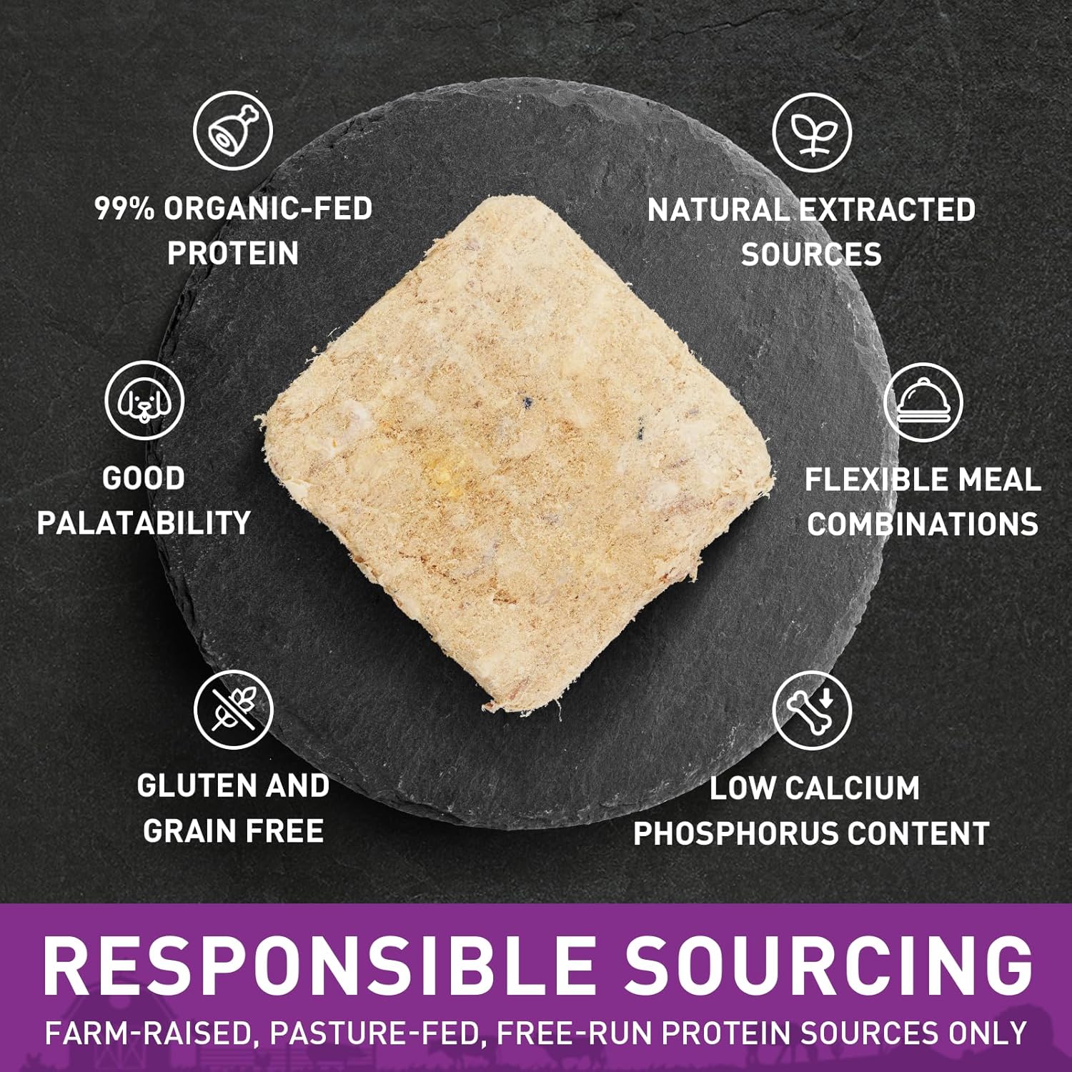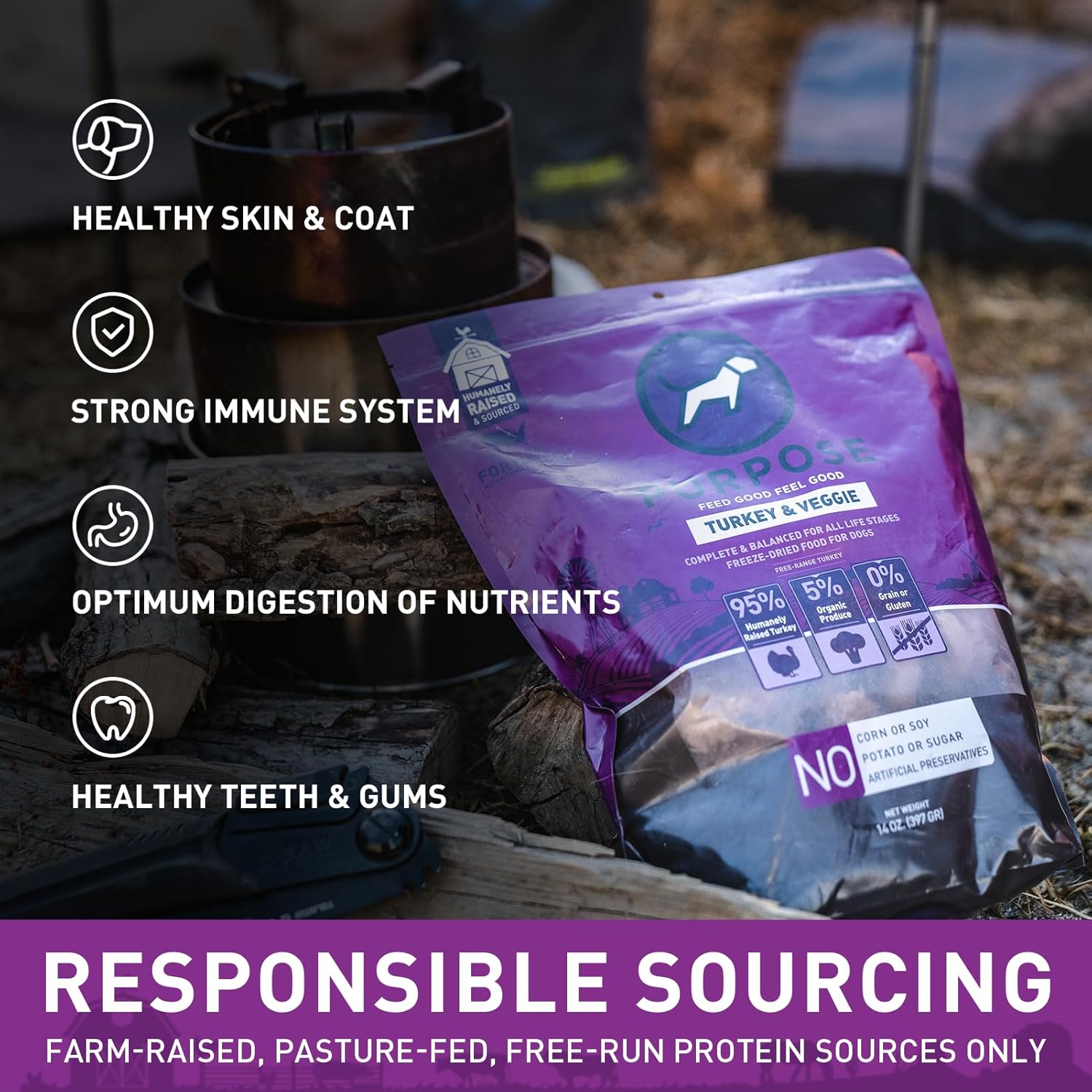About this item High-Protein Nutrition - Elevate your dog’s diet with PURPOSE Freeze Dried Raw Turkey Dog Food. Expertly crafted to exceed industry standards, this complete and balanced meal offers a powerful protein boost from prime, butcher-quality turkey, ensuring your pet experiences peak vitality. Suitable for all life stages and perfect for dogs with allergies or sensitive digestion. Locally Sourced Excellence - Choose a meal that supports American farms with PURPOSE Dog Food, made exclusively from high-quality proteins sourced within the USA. Every bite of our freeze-dried raw turkey dog food brings the freshness and nutritional value of local, sustainably-raised turkey to your pet's bowl, contributing to their health and your peace of mind. All-Natural Ingredients - Our PURPOSE Freeze Dried Raw Dog Food harnesses the pure goodness of whole animal protein. Free from fillers, dyes, artificial preservatives, and grains, our food offers a naturally wholesome option for sensitive dogs, supporting dental health and digestion through nutrient-rich, raw muscle and organ meats. Convenient Raw Diet - Embrace the benefits of a raw diet without the hassle. PURPOSE Freeze Dried Turkey Dog Food provides a convenient, healthy alternative to traditional dog food, retaining the authentic flavor and vital nutrients of fresh ingredients through careful preservation processes. Ideal for Growth and Aging - Tailored to support dogs at any stage of life, from playful puppies to seasoned seniors, PURPOSE Turkey Dog Food ensures a well-rounded diet that maintains overall health and wellness. Our gluten-free and grain-free formula is particularly adept at catering to pets with specific dietary needs. › See more product details
