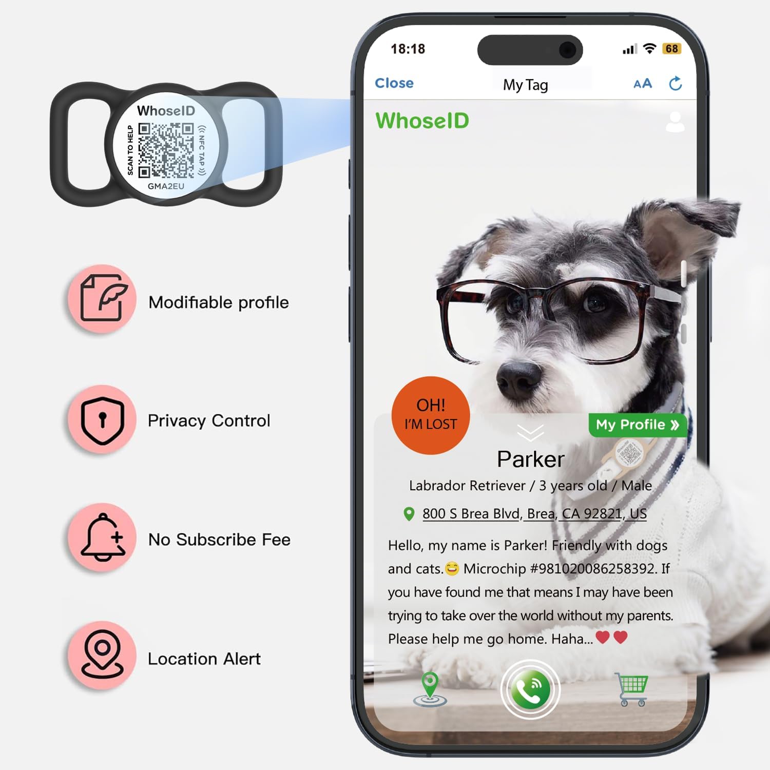 About this item This tag is made of food-grade soft silicone rubber, which makes it more skin-friendly and comfortable for pets to wear. It is lightweight, easy to use, washable, and waterproof, so it won't be a burden for your pets. It's a great accessory for dogs and cats Compatible with most pet collars – flexible openings designed to fit various collar sizes 3/8 inch to 1 inch wide, of course, this QR code slide-on tag can be used on dog collars & pet loop holders, clipped to harnesses, leashes, and any items that fit its size. You don’t have to worry about losing your pets anymore The QR code pet tag is a digital pet ID tag that can be scanned or tapped by a smartphone if your pet goes missing. The finder can access the pet display page to view your contact details and your pet's critical information. If you plan to use the tap method, please make sure that your phone has NFC function The pet tag is easy to manage and view profiles via mobile devices. You can manage multiple profiles with one account, requiring no electronics or batteries. The privacy control feature can effectively keep your private information safe, and you can decide when to show your contact information and when to keep it hidden. It is a one-time purchase with no subscription fee, and no app installation is required You can choose from a variety of color options to represent your lifestyle. If you encounter any problems, please feel free to contact us, and we will reply within 24 hours › See more product details