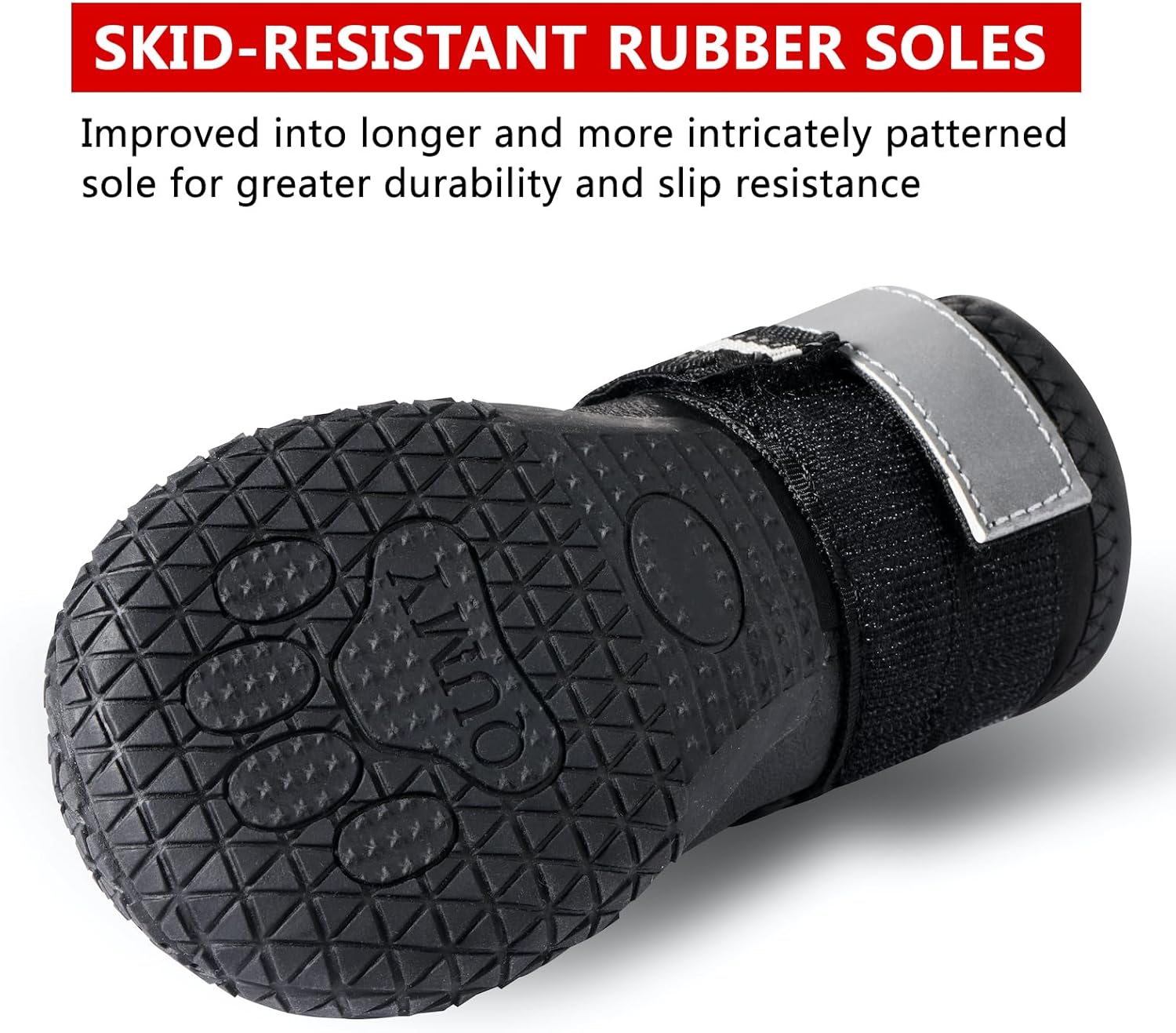 About this item Please be sure to measure the width of your dog's paws carefully, it is key to choosing the correct size for your dog, weight can only be used as an additional reference; Size 1: 1.8''x2.3''(W*L) for 11-23 lbs; size 2: 1.9''x2.4''(W*L) for 18-27 lbs; size 3: 2.0''x2.5''(W*L) for 23-33 lb; size 4: 2.2''x2.6''(W*L) for 31-40 lbs; size 5: 2.4''x2.8''(W*L) for 40-55 lbs; size 6: 2.6''x3.0''(W*L) for 52-65 lbs; size 7: 2.8''x3.2"(W*L) for 63-75 lbs; size 8: 3.0''x3.5"(W*L) for 74-90 lbs SECURE and ADJUSTABLE: Easy to put on / off. These dog shoes expands with a wide split seam opening and two adjustable and reflective straps to ensure a tight fit, also make your dog safe at night RUGGED: Tough slip-proof sole of dog boots provides stability and traction, protection from rough terrain QUALITY: The dog boots have a rugged sole and high quality fabrics that are then sewn together to ensure they are ready for your adventure FASHIONABLE: QUMY dog boots are with cute pet paw embroidery, paws side is the outside, soft and hand washable › See more product details