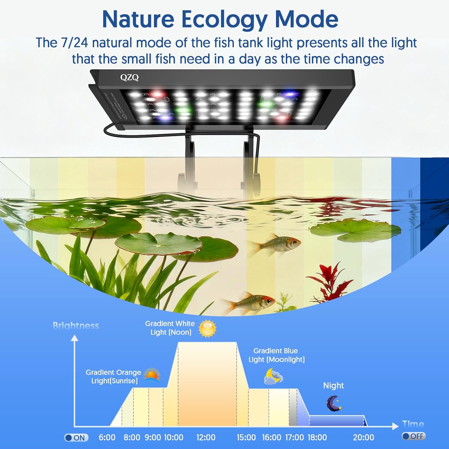 About this item High-Quality Aquarium Grow Light: QZQ aquarium light is made of a high-grade aluminum alloy housing with a striped design for efficient heat dissipation, extending the lifespan of the aquarium lamp. Equipped with high-definition 5050 and 2835 LED chips, it provides all the necessary spectrum for healthy aquarium plant growth, making it an excellent fish tank accessories for creating a thriving aquatic ecosystem. Personalized Fish Tank Light: Adjust the fish light to your preferences and your fish’s living environment. The controller allows you to switch between 8 single-color modes and full-spectrum cycling, with 6 timer settings and 10 brightness levels (flicker-free), giving you a personalized aquarium experience. 7/24 Cycle Mode: LED aquarium lights’ smart 7/24 cycle mode simulates a natural sunrise-to-sunset rhythm. By default, the light turns on at 6:00 AM and off at 11:00 PM daily. Simply set the controller to the current time to activate this mode. (Note: brightness is not adjustable in 7/24 cycle mode.) Flexible Installation Options: Aquarium light comes with a versatile clip-on bracket that allows easy adjustment of height and angle. Compatible with both framed and frameless tanks up to 0.9 inches glass thick, this aquarium light is ideal for 10-gallon and 20-gallon tanks. Smart & Durable: Fish tank light comes with a power-off memory, automatically retaining your settings after a power cut or when turned off. Once power is restored, the light resumes the same mode without resetting. LED fish tank light uses the latest sealing technology to ensure it is dustproof, splash-resistant, and extremely durable. › See more product details