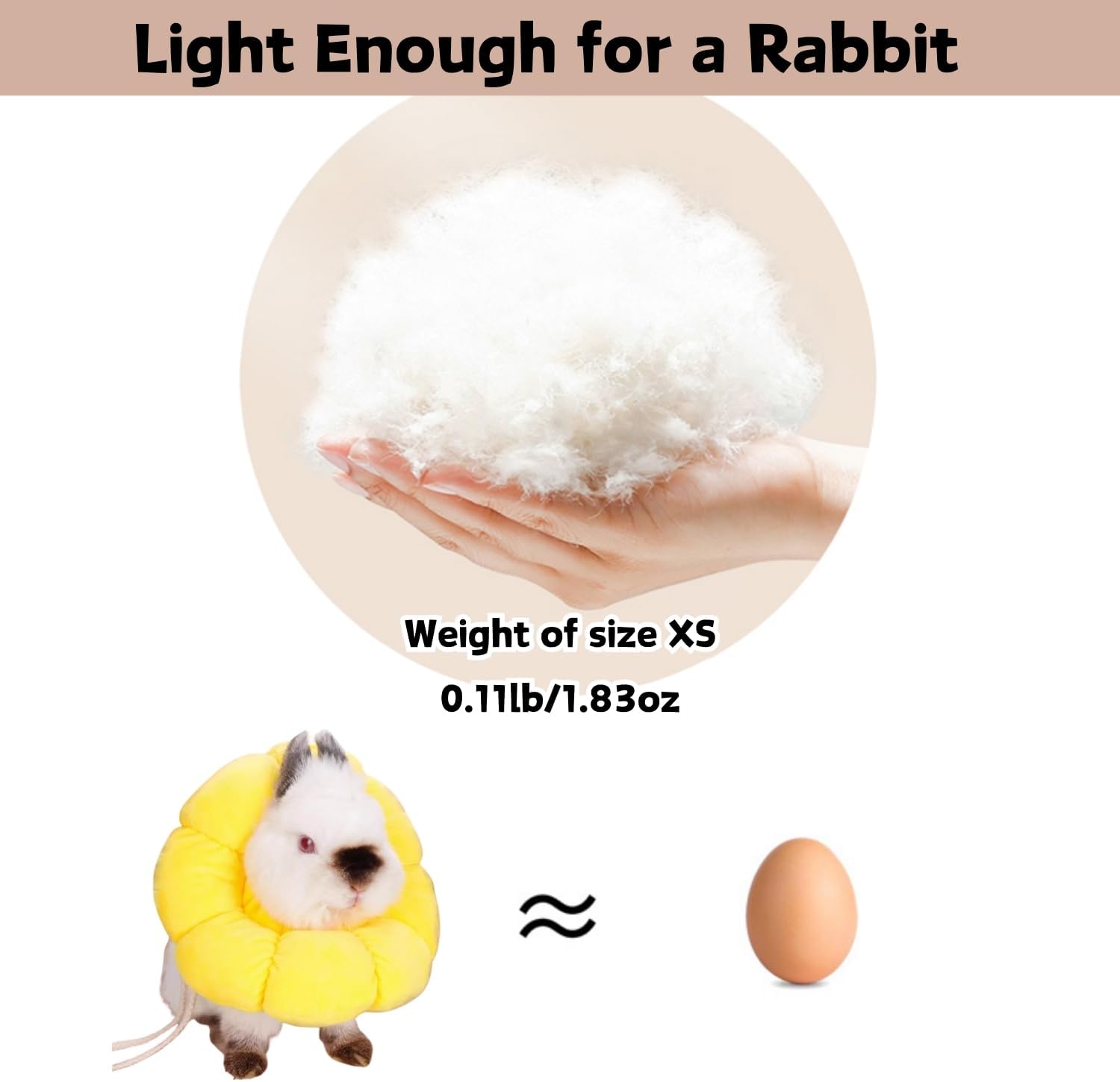 About this item Adjustable Size: SEZDEKI pet recovery collar is designed with an adjustable elastic strap, it can be adjusted to a suitable size to ensure that it will not slip out easily.Size XS fit for rabbit/chinchilla/guinea pig/ferret/kitten/puppies with head circumference between 3.9"-7.0"(10-18cm).Please measure the size of your pet before order, take each measurement a bit loosely. Soft and Lightweight:This Elizabethan E Collar for rabbit is made of rich cotton material, this extra small cone collar is lightweight and will not hinder movement or activity, while allowing pets to eat and drink normally.More comfortable sleep to help wounds heal faster. This neck cover has slightly waterproof function, just wipe clean with a damp cloth daily.It also support machine washable. Protect Your Rabbit:The wound healing protective cone collar is a safe and good method of preventing pet from aggravating a healing wound or injury.The cute sunflower collar will not block your rabbit's vision, they can eat, drink, sleep and play normally.Whether post-surgery, to prevent licking or scratching wounds, pet nail trimming, this donut shape works better than traditional cones and flat cones. The Perfect Alternative: The sound of a plastic medical collar may scare your beloved pets that are sensitive to noises.Tip:Stretchy string allows easy adjustment to ensure a proper fit as your pet grows.Please tie the string with a bow and rotate the button to the back of pet.If the string is too long, you can trim it slightly. Adorable Costume: Cute sunflower shape neck cone add more fun and laughter to your rabbit and your family during its recovery time after surgery.It can be used as a soft pillow and lovely decoration,great for photo shoots, party times or for Halloween or Christmas day. › See more product details