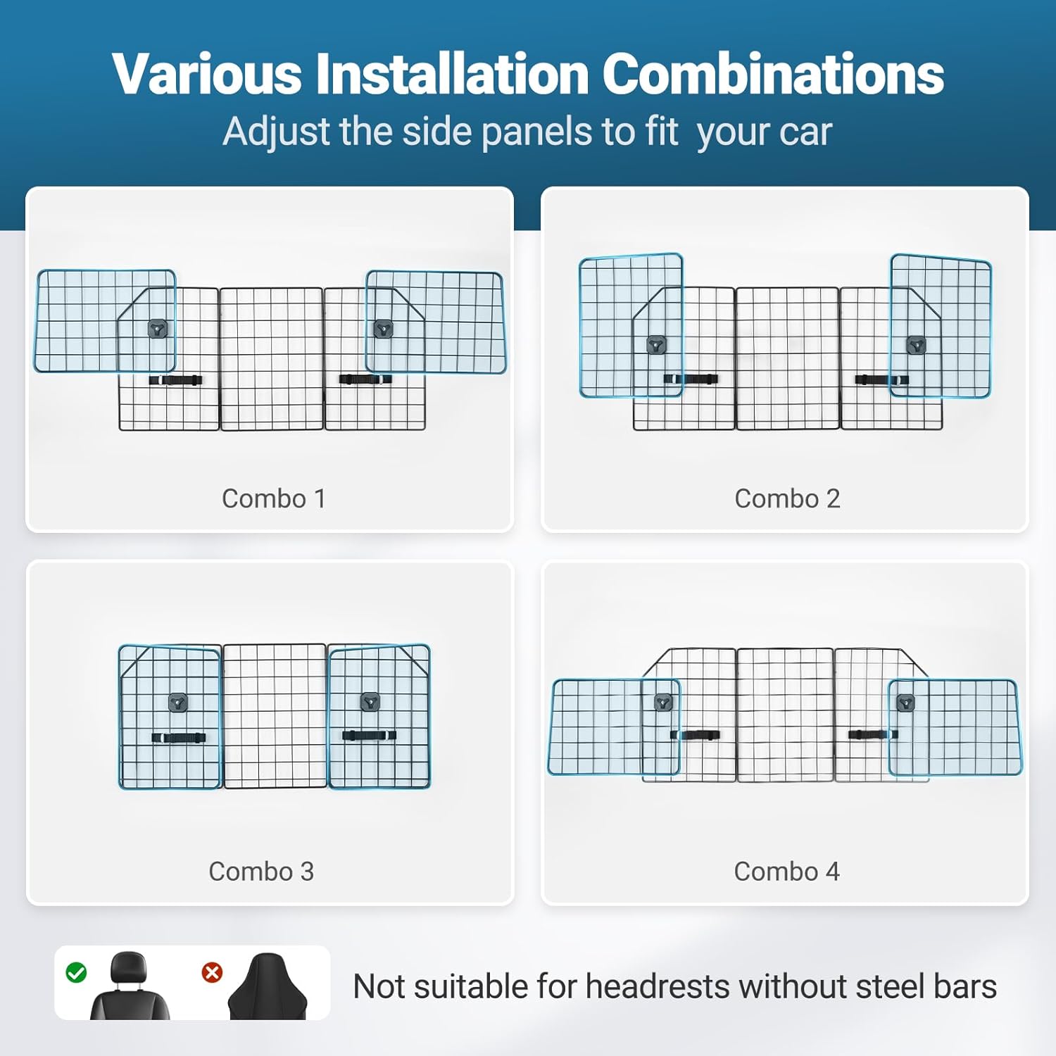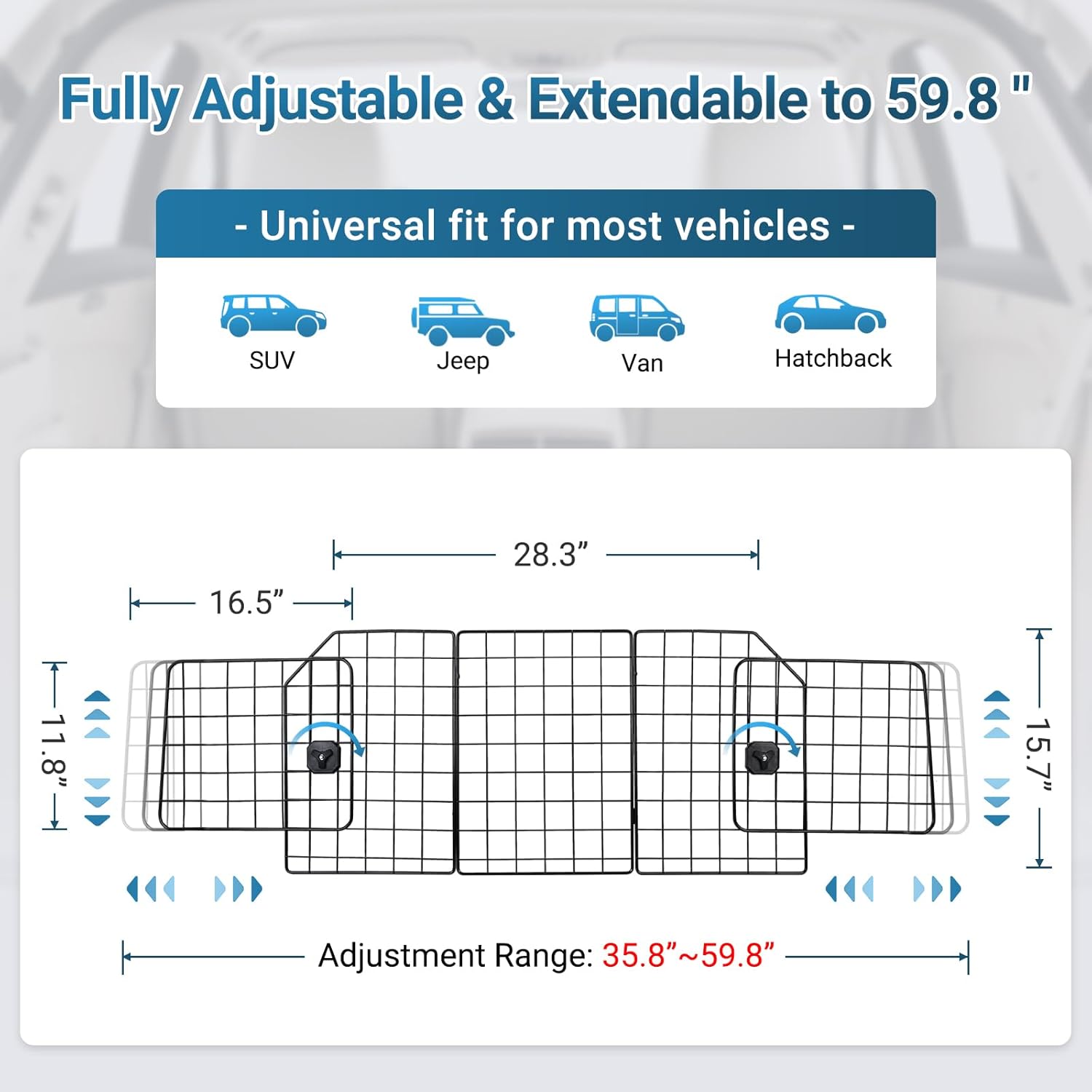 Ensure Travel Safety: This dog car barrier comfortably confines your pet to the back of the car, preventing it from jumping into the front seat, reducing driving distractions and keeping everyone safe. Two long-lasting straps hold the dog barrier tightly to the headrest so it won't swing easily even if an aggressive dog pushes it, and the smooth edges won't scratch your dog Triple Folding Design: Unlike other car dog barrier with a one-piece main panel, our dog gate features a unique triple-folding design that easily folds down to a compact size of 17.0" (L) x 12.0" (W) x 2.3" (H). Easy to install and remove, portable to fold up and store in the garage or trunk when not in use, convenient for you to travel with your pet Universal Fit: rabbitgoo dog car guard comes with one folding main barrier (35.8"x 15.8") and two side panels (16.5" x 11.8") with an adjustable range from 35.8" to 59.8", suitable for most SUVs, vans, jeeps and hatchback. Sturdy and Stable: The dog barrier for SUV is made of high-quality steel with reinforced wire mesh which can withstand well even if the dog claws at it violently. Heavy-duty and rust-proof material for long-term use. It also comes with 2 sturdy nylon straps with metal grips that secure the dog gate to the car headrest for extra stability Easy & Quick Installation: rabbitgoo dog divider is easy to install, no tools required, just 3 simple steps. Simply unfold the main panel, secure the side panels to the main panel with 2 clips, and finally secure to the car headrest with straps. Note: It is recommended that two people work together to install the dog barrier › See more product details