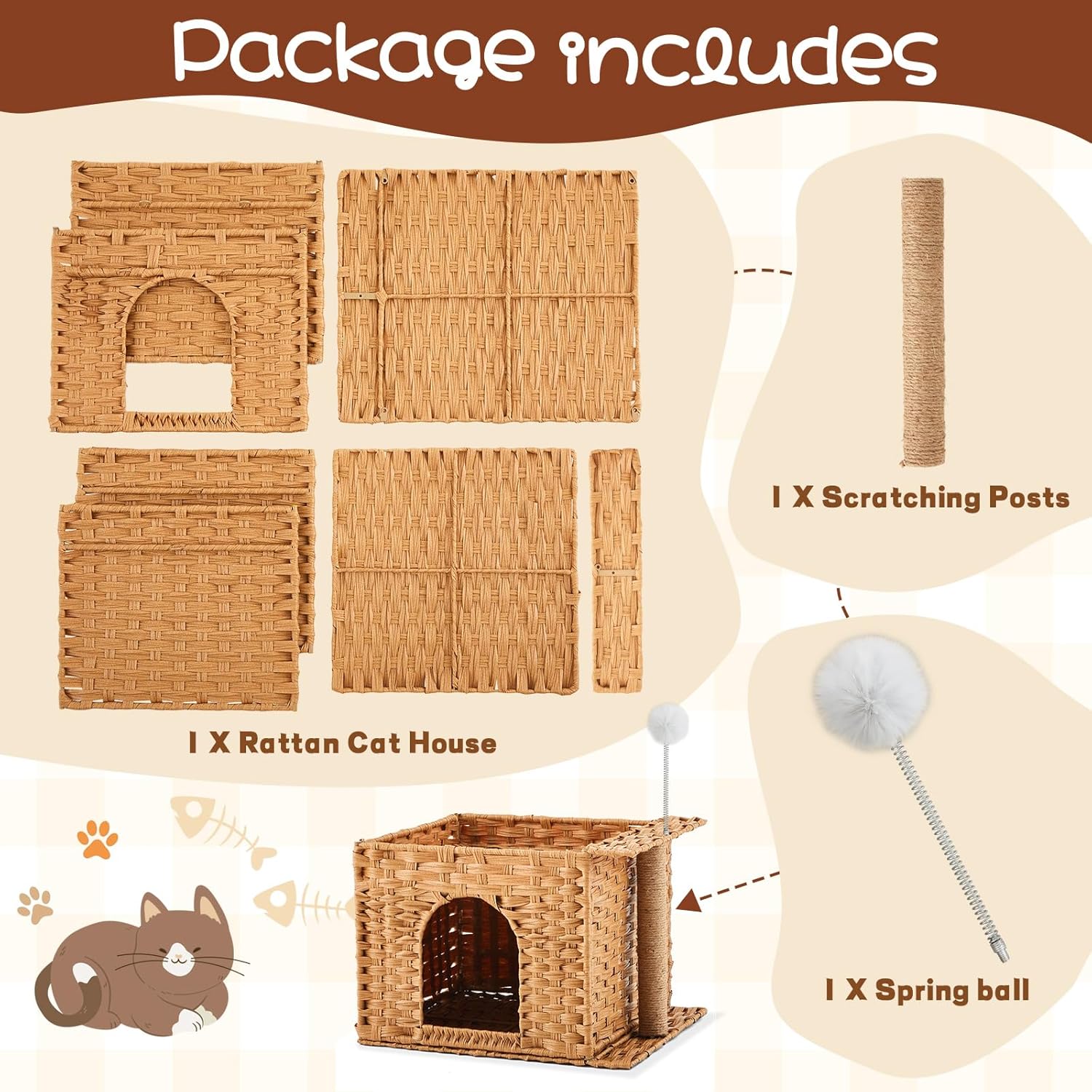 Features: The natural wicker texture and minimalist enclosed design elevate your home's style. The covered cat cube house is equipped with scratching posts, hanging plush balls and spring balls design to provide interactive fun for your feline friends, keeping your cat engaged and happy. Specifications: Material: polypropylene rattan Color: natural Style: rustic Size: about 18.5 x 13.78 x 12.6 inches/ 47 x 35 x 32 cm Package includes: 1 x Rattan pet cube house Notes: Manual measurement, please allow slight errors on size. The color may exist a slight difference due to different screen displays. Small items are included, please keep them away from pets in case of choking risk. Before purchase, confirm whether the product size is suitable for your pet, and observe the pet's reaction when using. Please remove the product in time if there is any discomfort.