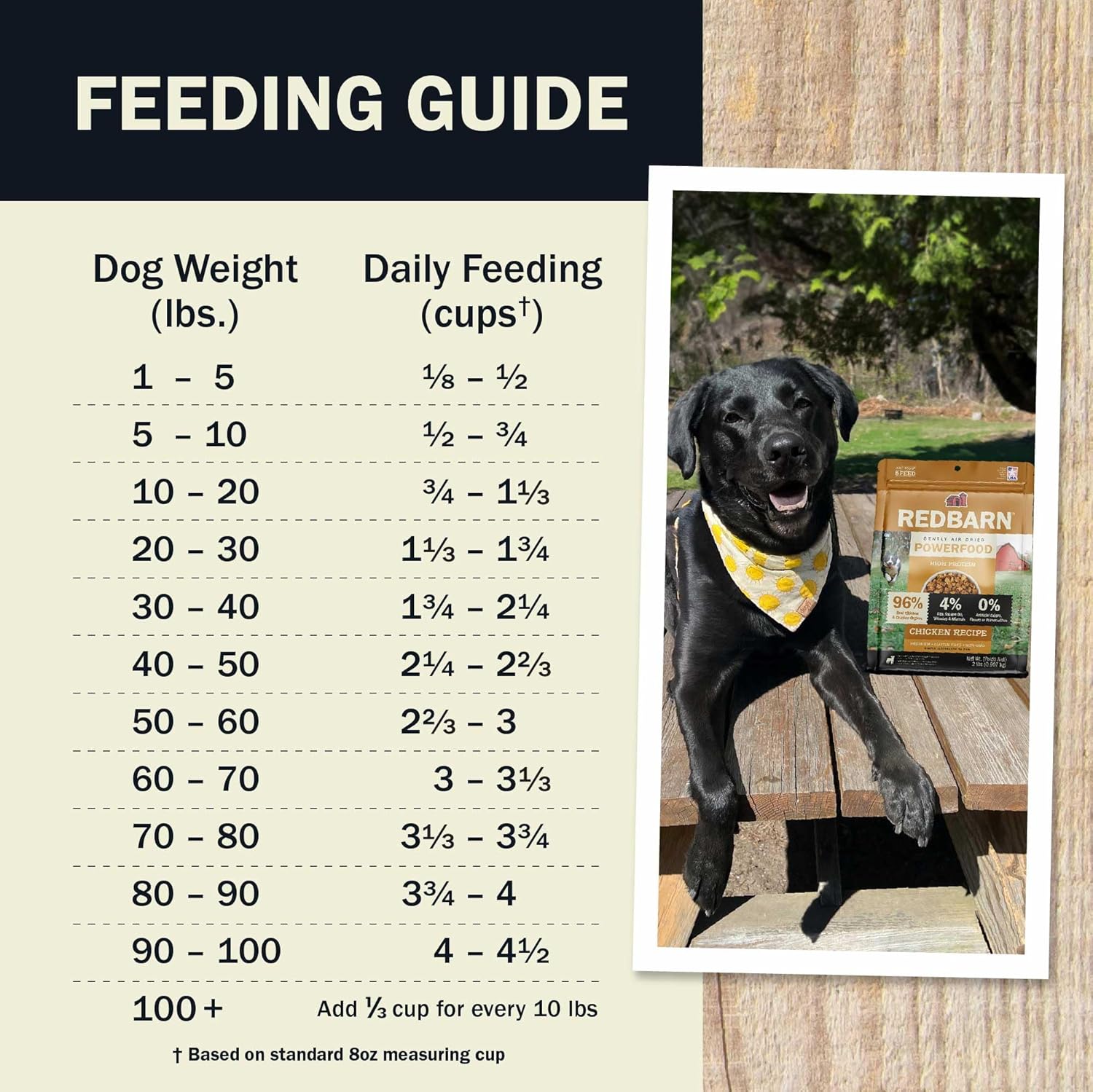 - Directions: Feeding Amount - 0-3 Months 1/2–1 lbs (1/4–1/3 cup) - 3-6 Months 1-5 lbs (1/4–3/4 cup) - 6 months to Adult 5-10 lbs (3/4–1 1/3 cups) - 10-20 lbs (1 1/3–2 1/4 cups) - 20-30 lbs (2 1/4–3 cups) - 30-40 lbs (3–3 3/4 cups) - 40-50 lbs (3 3/4–4 1/3 cups) - 50-60 lbs (4 1/3–5 cups) - 60-70 lbs (5–5 2/3 cups) When switching your dog’s diet, we recommend that it be done gradually over a 5-7 day period.