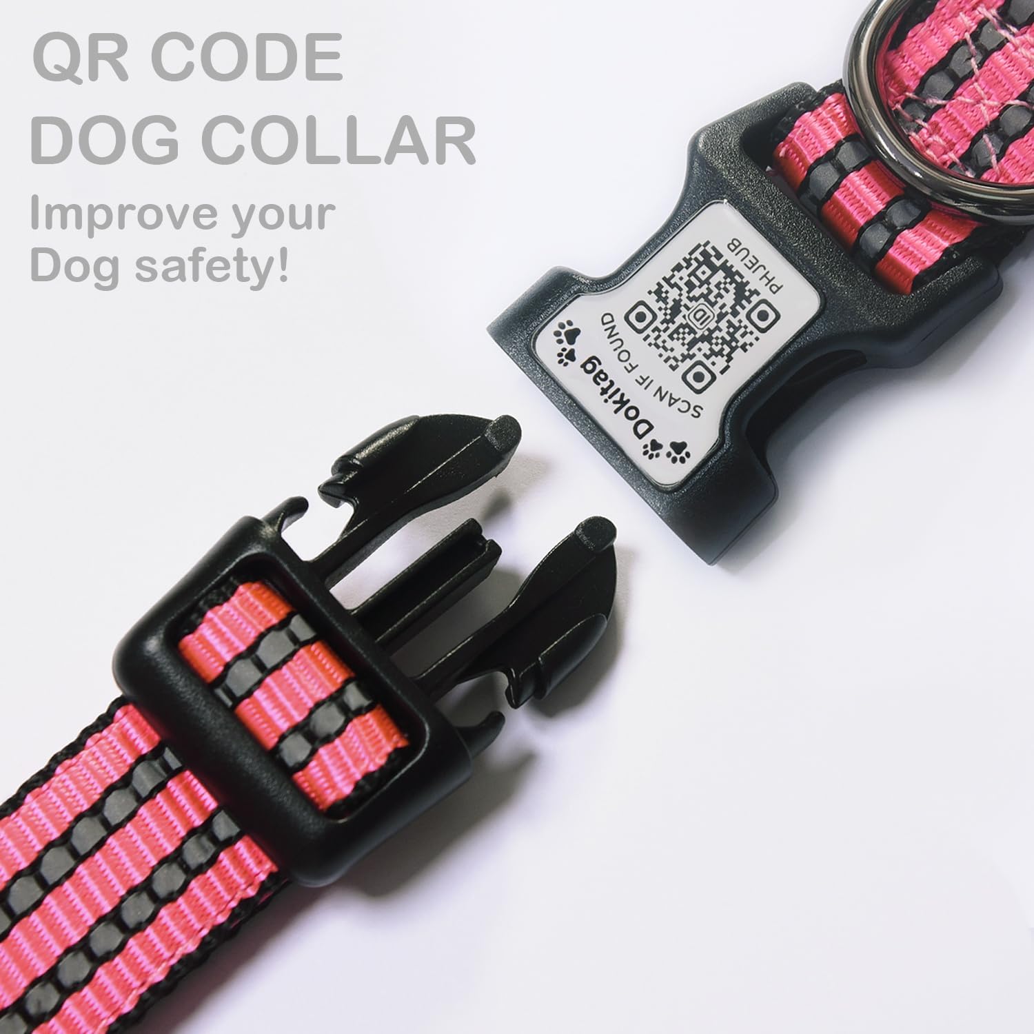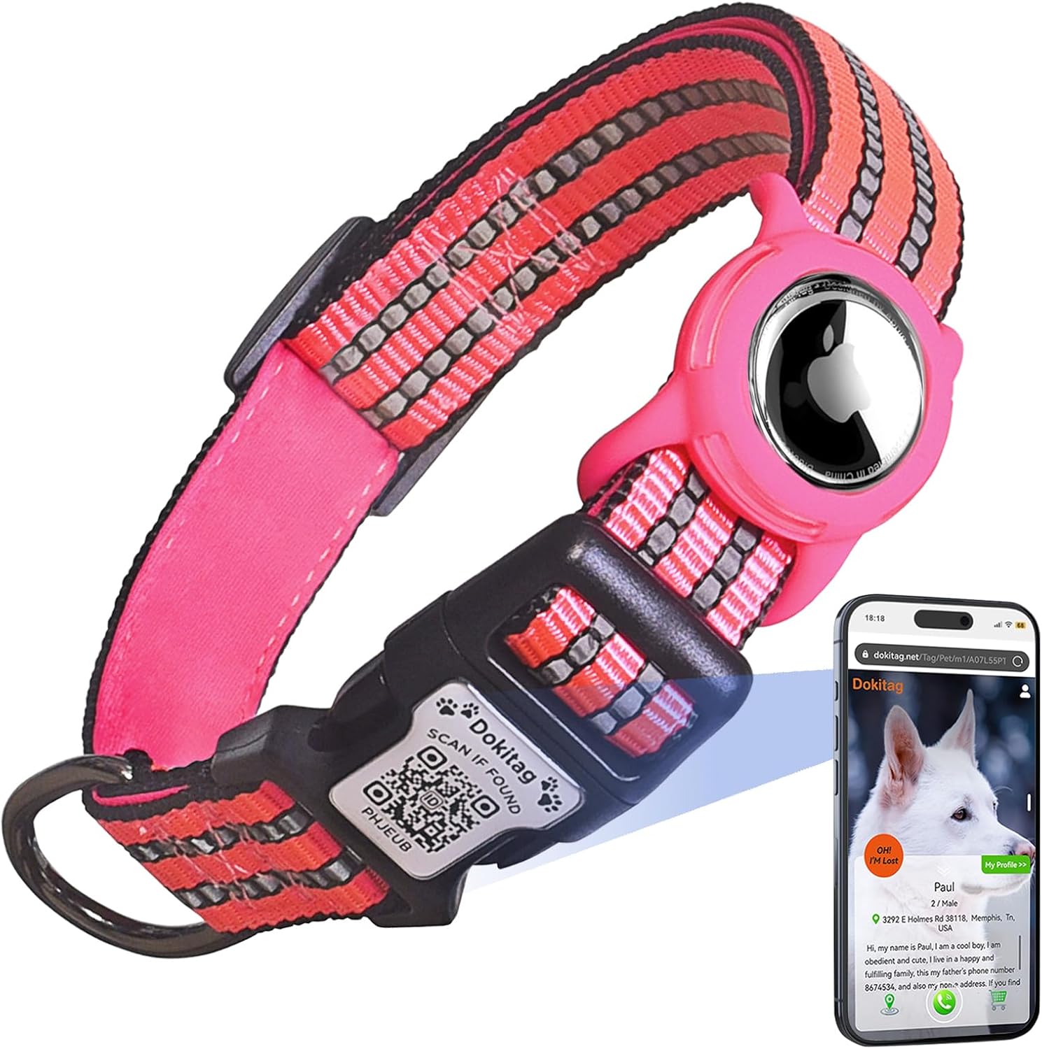 About this item Size Description:Our dog collar features an innovative adjustable strap that effortlessly adapts to necks from 10" to 26", ensuring a snug yet comfortable fit for dogs of all breeds. Choose from three thoughtfully designed sizes:S(10"-15"),M(13"-22"),L(16"-26"),please measure the length of your dog's neck before purchasing to choose a proper collar. Airtag Case&QR Code ID tag:The dog collar equipped with an AirTag and QR Code Pet ID Tag provides dual protection for your pet, ensuring you can quickly locate your dog wherever it may be. The AirTag holder is specifically designed for Apple AirTags, offering perfect compatibility with AirTags while protecting them from damage..(AirTag Not Included) Personalized Dog Collar With Pet ID Tag:Scan the QR code on the collar buckle to activate the tag, create an profile for your pet, you can add multiple emergency contacts, upload multiple pet photos, your home address, etc; One account can manage multiple pets;Anyone who finds your pet can access your pet's profile and contact you to return it home;No need for APP, No Subscription fee! Receive Instant Email:If your pet is lost and someone finds it and scans the QR code on the tag for PET information, they can send the address to your e-mail or phone to contact you,You'll find it quickly; quick and easy,it's not a gps. Premium Quality Materials & Enhanced Reflective Safety:Crafted from high-quality 100% nylon webbing,our dog collars are soft,durable,and resistant to daily wear and tear; The collar's reflective stitching enhances nighttime visibility, ensuring your dog's safety during low-light walks. The quick-release buckle provides an added safety feature in emergencies. › See more product details