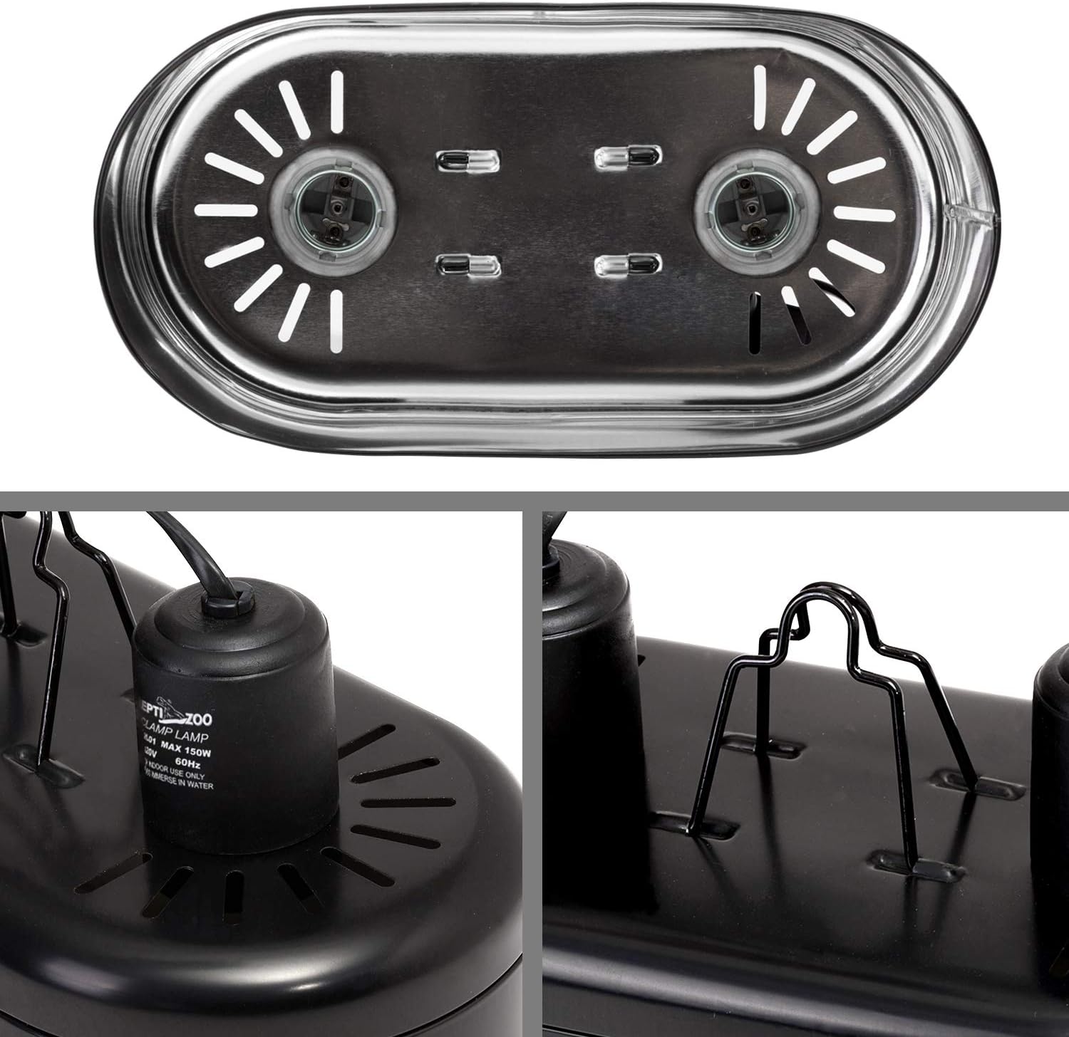 About this item Dual lamp cap integration design, each can bear Max 150W(suit for Reptile ceramic heat lamp, UVB UVA basking spot lamp, UVB lamp, daylight lamp, nightlight lamp, Infrared Spot Lamp, and so on) Solid and heat-resistant ceramic lamp caps ensure long-term use. Two independent switch power lines for easy control separate lamp. The hanging hook is easy to hang with the lampstand. The top reserves radiating and ventilating holes to ensure a good heat dissipation effect and extend the life of the lamp in the dual light fixture. Our REPTIZOO lamp fixture holds an ETL certification. Should you have any inquiries regarding our product, please reach out to us, and we will respond promptly to assist you within 24 hours. › See more product details
