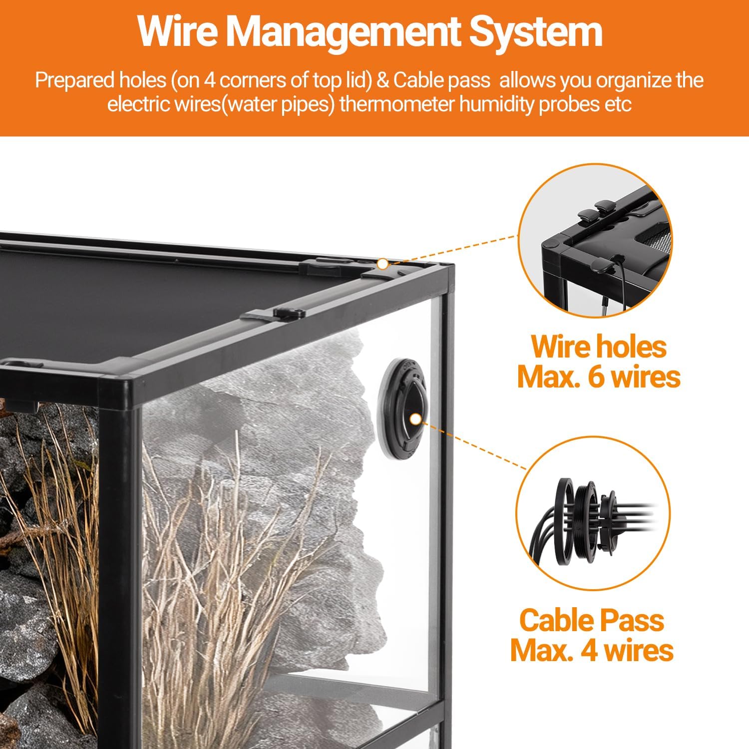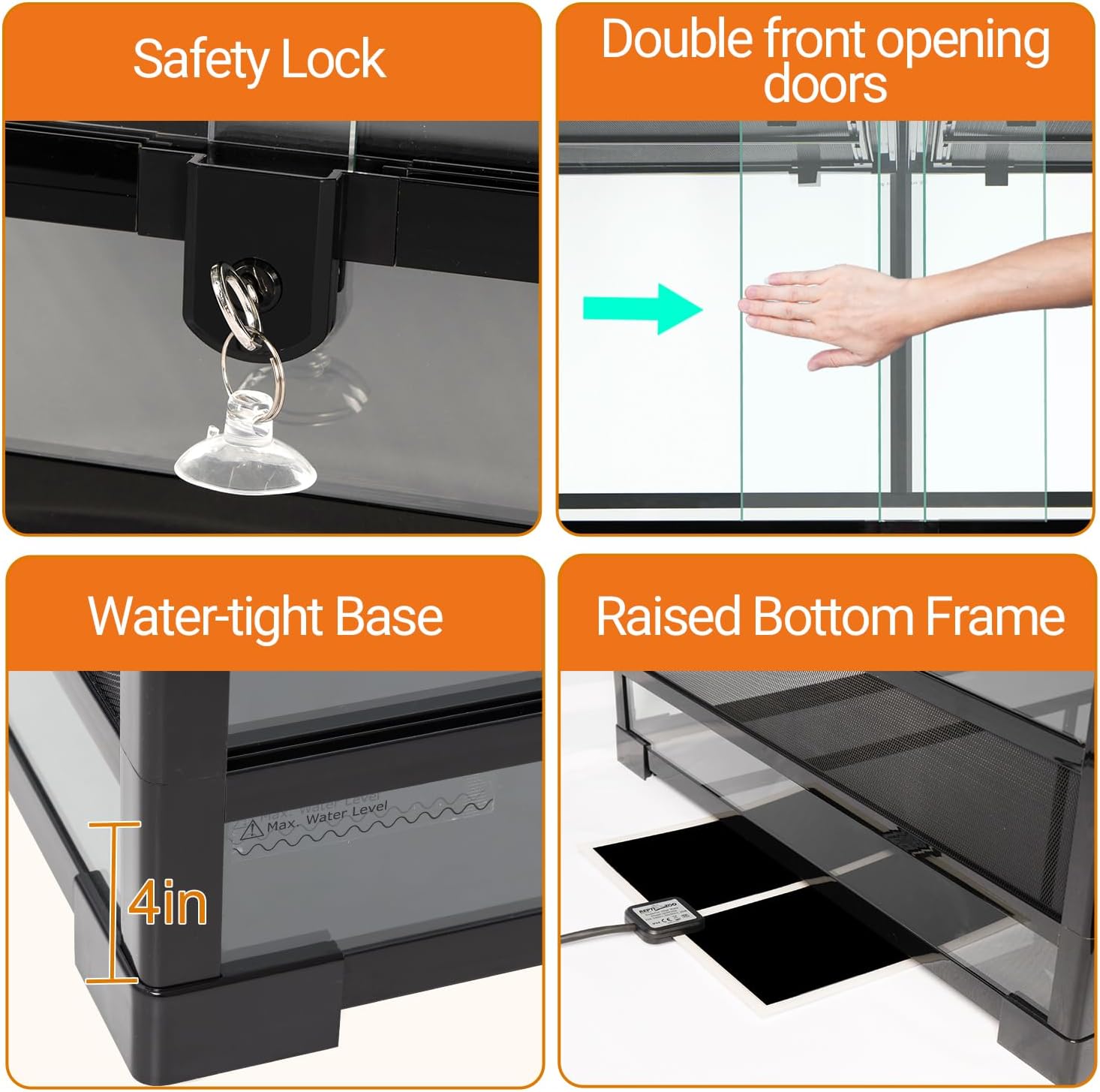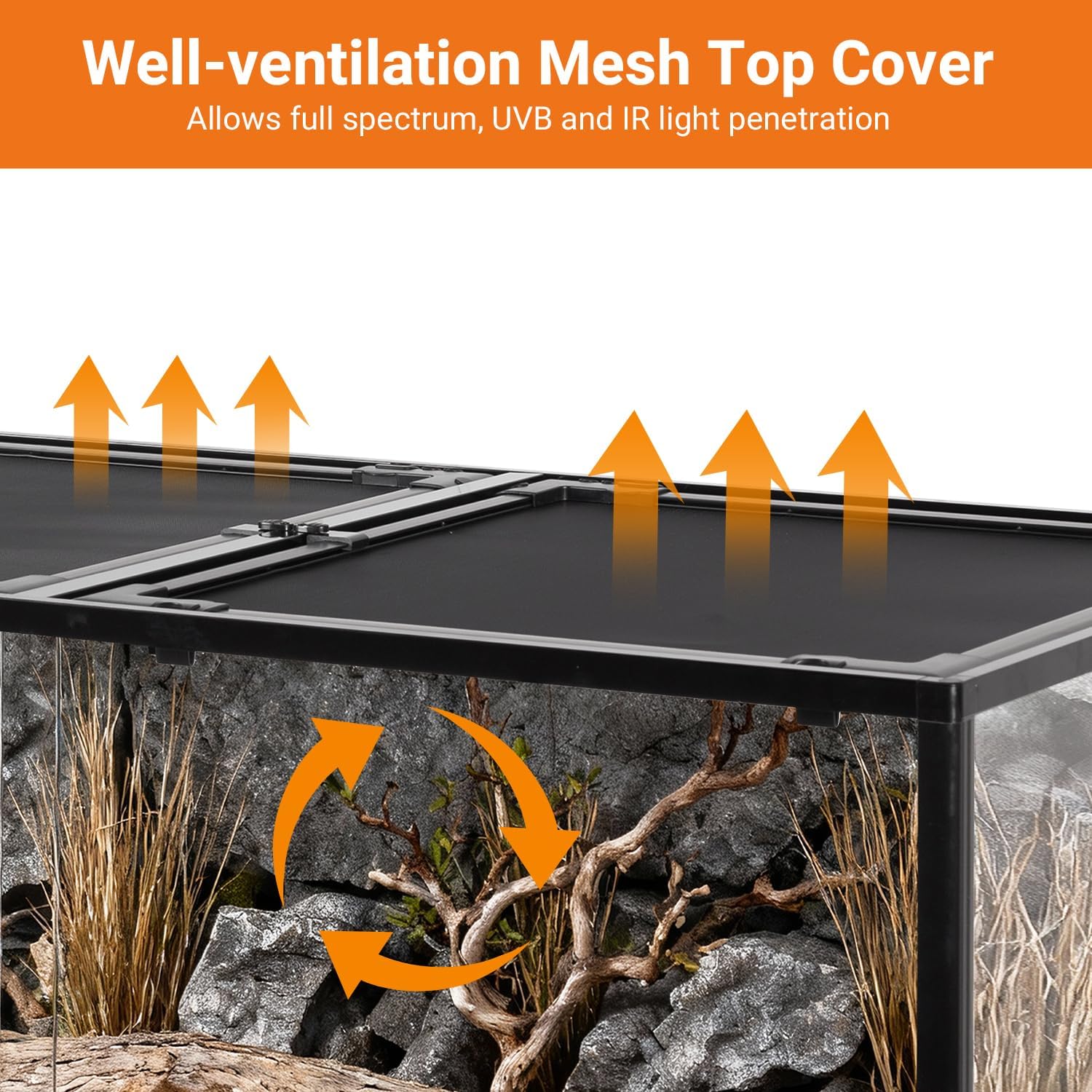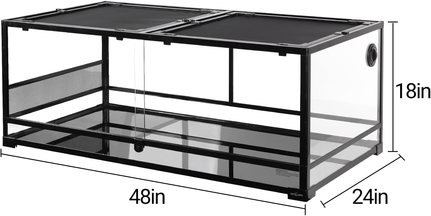 About this item 【85 Gallon Desert Reptile Terrarium】48''Lx24''Wx18''H tempered glass terrarium. Sturdy, dependable, time-proven design. Specifically designed for desert reptiles and amphibians, such as bearded dragon, young adult sulcata tortoise, juvenile aldabrachelys gigantea, leopard tortoise, python regius etc. 【Excellent Breathability】In addition to the top screen cover, we prepare 2pcs mesh panels for sides of terrrarium, it could be interchanged with a side glass panel.(Mesh vent panel can be for better balance of moisture and ventilation. ) 【Waterproof Base Tray】4" deep waterproof base allows for a "water pool" inside the terrarium, or a natural water feature for an amphibian. So this terrarium can be used both as desert reptile terrarium and rainforest tank. 【Front Sliding Door】Front sliding openning doors can open separately, easy to feed your pet, clean inside and add decoration. 【Raised Bottom Frame】The bottom glass panel of the terrarium is raised to facilitate the mounting of a substrate heater or heat cable. 【Flat Packing & Easy to Install】Comes with knock-down design, easy to install or disassemble in several minutes with step by step instructions. Our all glass terrariums are carefully packaged with double box of tough cardboard and thickened reinforced foam for transportation. Should you have any questions when receive it, please feel free to contact us. Free replacement service provided for damaged parts. › See more product details