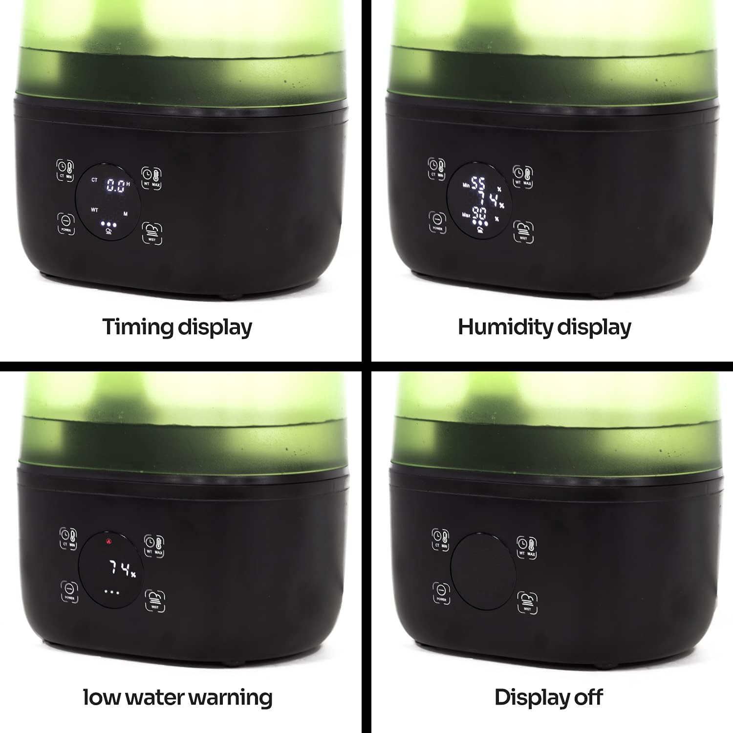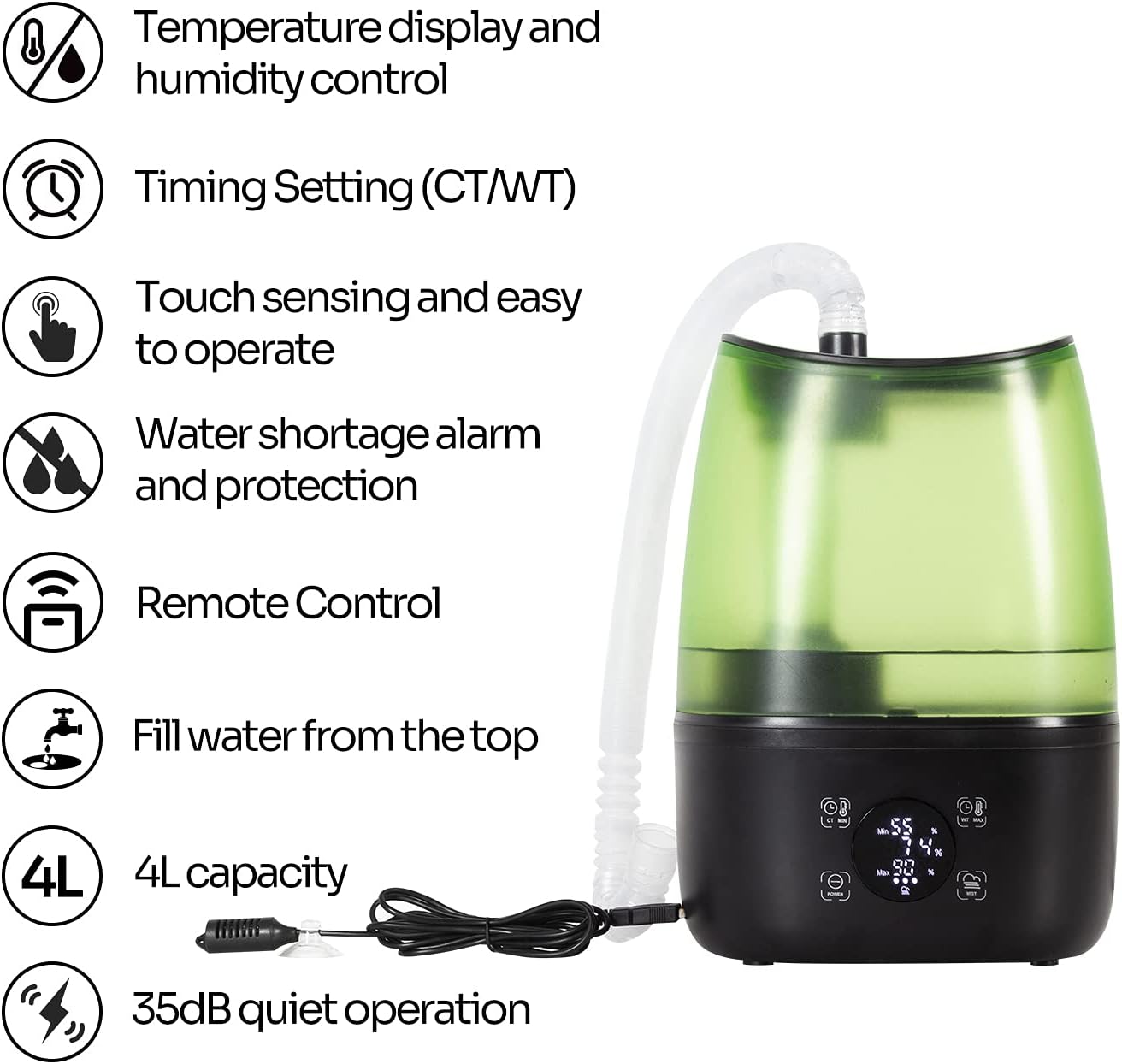 About this item 2 IN 1 MODE USE: Patented Designed with built-in timing or USB humidity controller. This reptile humidifier uses the intermittent timing principle to set the spraying frequency, interval time, and spray duration for repeated periodic humidification without USB. It can also detect the humidity level in the terrariums and work according to the set humidity range with USB. Minimum & maximum setting values, current temperature, and current humidity values are displayed clearly on the large LED screen. ULTRA-QUIET PUMP & ADJUSTABLE MISTING: The reptile humidifier/fogger works very quietly, providing a comfortable environment for your reptile pets. The misting level can be adjusted with 100ml, 200ml, and 300ml per hour and the tube can extend from 1.3 to 5.3 feet. The suction cups help you fix the tube to the spreading direction unrestrictedly. 4L TANK & DRY-OUT PROTECTION: The reptile fogger/humidifier with 4 Liters large tank allows 12 hours or more of working time in max misting level(300ml/per hour). When water runs out, the reptile fogger will shut down automatically to keep security. TOP FILLING & EASY CLEAN: The lid of the reptile humidifier can be removed easily for cleaning or filling, it is easy to add water from the top instead of turning over the tank, and please clean the reptile fogger regularly every month to avoid leakage. ONE-YEAR ASSURANCE: We Promise One Year Assurance, If you are not satisfied, please reach out to us, and we will reply to you within 24 hours. › See more product details