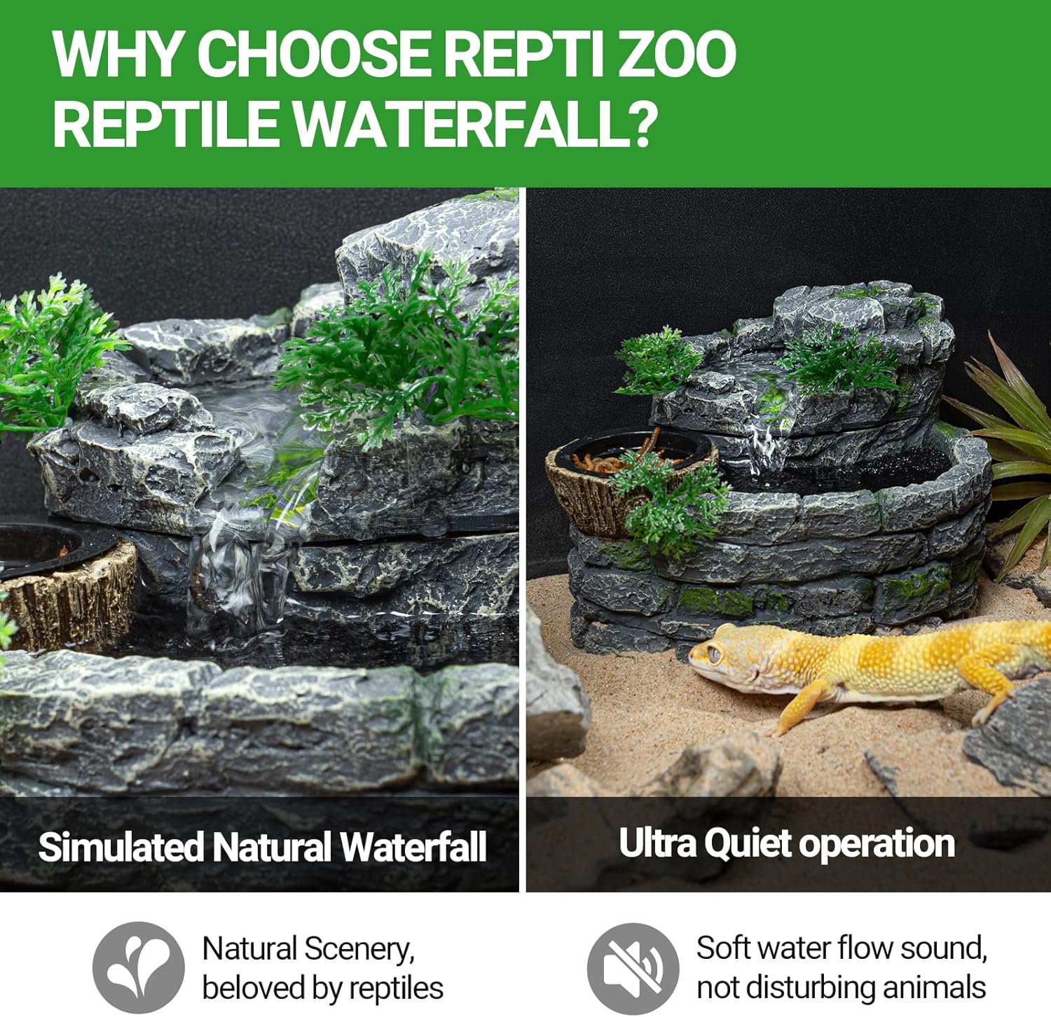 About this item đżăSIMULATED NATURAL REPTILE WATERFALLă: REPTI ZOO Rock Block Reptile Waterfall ingeniously mimics the flowing cascade of nature, providing your reptiles with an environment that feels like the wild, fresh and natural. Suitable for reptiles and amphibians, such as chameleons, bearded dragon, crested gecko, leopard gecko, lizards, tree frogs, turtles, etc đ§ăENCOURAGE TO DRINK & INCREASE HUMIDITYă: A continuously flowing water source can not only attract reptiles to drink water and help them stay hydrated, but also increase air humidity, prevent skin dryness and dehydration problems, and promote reptiles health. đăULTRA QUIET OPERATIONă: Reptile Drinking Fountain uses advanced silent pump technology to ensure gentle water flow, it will not disturb you or unsettle your reptiles. đ„ŁăBOTH DRINKING & FEEDINGă: Reptile Terrarium Waterfall with a capacity of 550ML and a flow rate of 220L/H, two plastic feeding basins meet the water feeding needs of various reptiles. Made of high-quality, non-toxic resin materials to ensure the health and safety, durable and trustworthy. đšăEASY TO MAINTAIN & CLEANă: Contains 2pcs filter cotton, 1 of which serves as a replacement to ensure pure water quality. Suggest cleaning once a week and replacing the filter screen once a month; Unique detachable structure makes cleaning and maintenance unprecedentedly simple. You can easily disassemble various components, clean quickly, and ensure water quality clean. đĄăENHANCE DECOR AESTHETICSă: Not only is it an ideal home for reptiles, but it can also be used as interior decoration to add a natural beauty to your home space. A Necessary tools for reptiles hobbyists and professional breeders. âș See more product details
