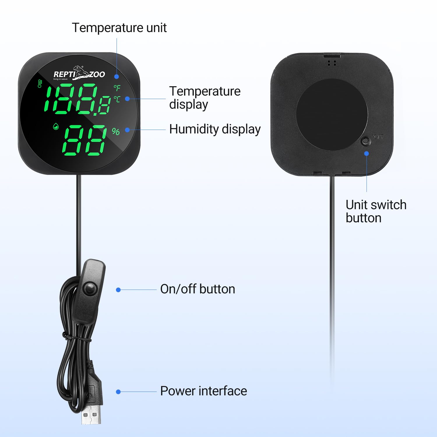 About this item 【Reptile Tank Accessories】This 2-in-1 Thermo-hygrometer can accurately track the temperature and humidity inside your reptile terrarium to ensure the environment for pet rearing as close to the natural environment as possible. 【Highly Accurate Measurements】Unlike traditional physical measurements, this reptile thermo hygrometer is equipped with a built-in high procision measurement chip and sensors to monitor subtle changes in temperature and humidity in real-time. Temperature measure range: 32℉~140℉/0~60℃; Humidity measure range: 10~99%RH. (Switchable between ℃ and ℉ to fully meet user need) 【High-definition LED Display】This REPTI ZOO digital thermo-hygrometer has an easy to read LED display (3 inch backlight LED display) for simple and accurate temperature and humidity readings in your reptile tank even at night. 【Easy to Use and Installation】Comes with 3M double sided tapes, this hygrometer can easily attach to the front or back of the terrarium, simple and convenient. Easy to use, plugged in and ready to use immediately. It also has a 55.2 inch long cable with on/off button. 【What Will You Get】1pcs REPTI ZOO Digital Thermo-Hygrometer with USB Charging Cable (55.12 in) ; 1 set Velcro; 4pcs Double-sided tape; 1pcs Use manual. You could contact us at the first time if there is any problem with this product, we will deal with problem within 12 hours. › See more product details